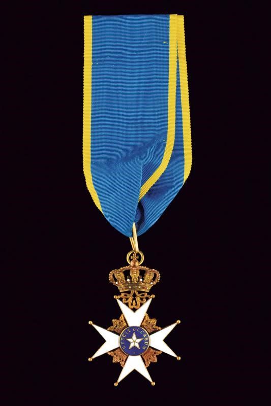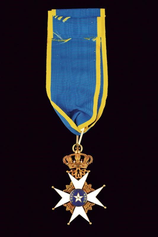Prima metà del XX Secolo Croce di commendatore in metallo dorato e smaltato. Su nastro da collo. In astuccio originale con timbro di un gioielliere di Stoccolma.