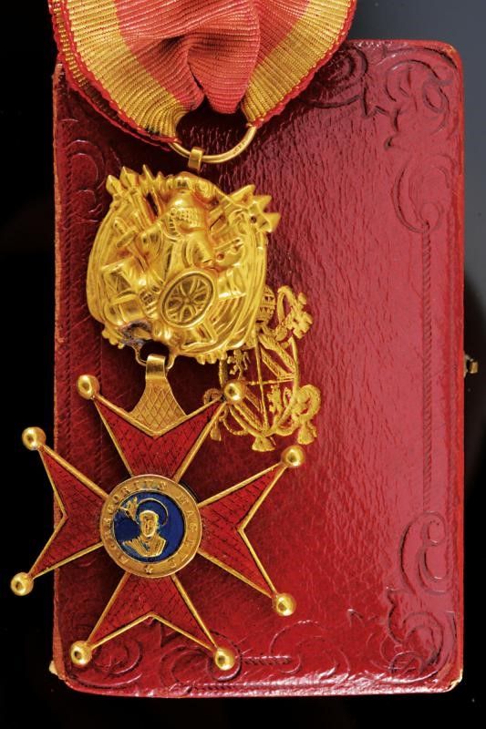 1860-70 Croce da cavaliere militare, in oro e smalti; completo di nastro originale. Nel suo astuccio rosso con stemma di Papa Pio IX (1846 - 1878) in oro, foderato all'interno di seta e velluto.