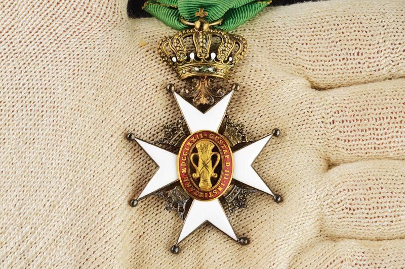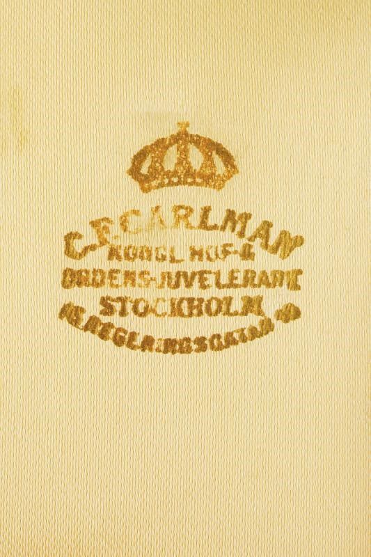 1900 circa Croce da cavaliere in bronzo smaltato, il medaglione al centro in oro con smalti. Su nastro originale. In scatola originale con timbro di un gioielliere di Stoccolma.