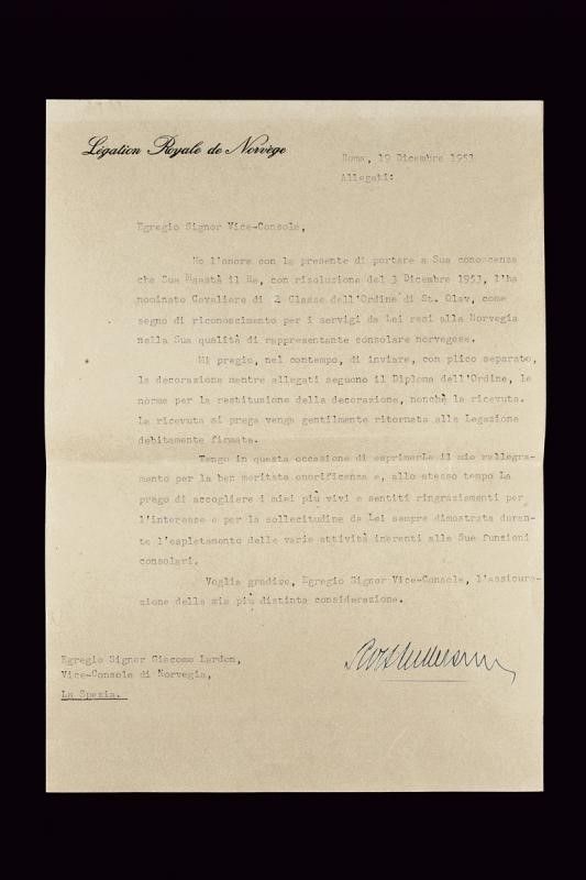 Norvegia, dimensioni 4.1 x 6 cm. 1953 Croce da cavaliere di seconda classe, in oro e smalti. Su nastro; in astuccio originale marcato 'TOSTRUP 1832' e con nome dell'ordine sul coperchio. Insieme con il documento originale di conferimento e la lettera di consegna.