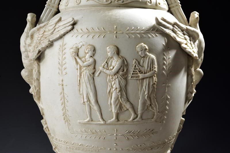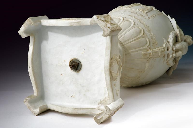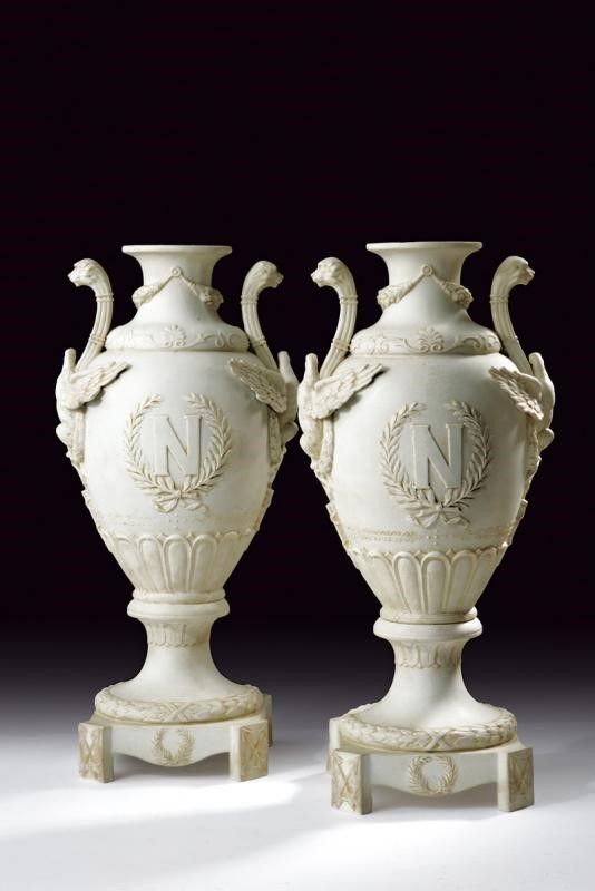 Francia, altezza 38 cm. 1900 circa La parte anteriore con monogramma 'N' entro corona di lauro, i fianchi con maniglie terminanti a testa di leone tenute da aquile poggianti su un fascio littorio. Il retro di un vaso con raffigurazione di tre musicisti, l'altro con tre allegorie femminili. Le basi a quattro piedini con serti d'alloro e frecce incrociate.