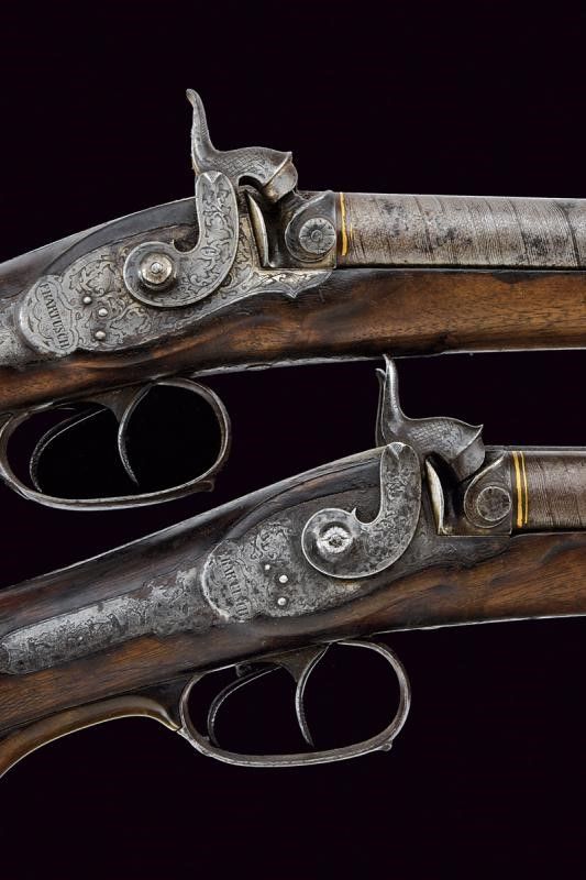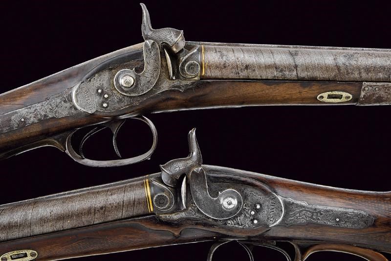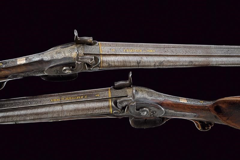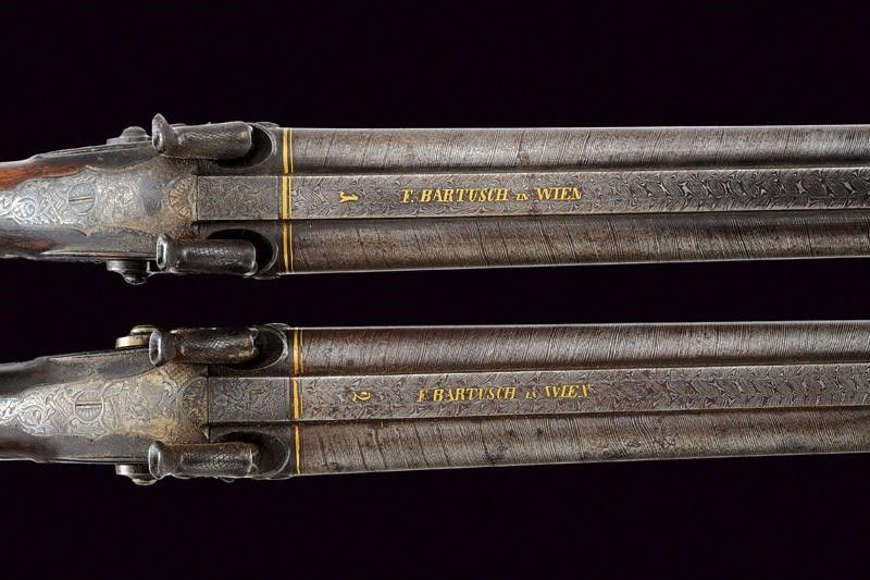 Canne lisce (pulite, pitting), tonde, in fine damasco, con bindella marcata in oro 'F. BARTUSCH IN WIEN' e numerate '1' e '2', le culatte con incisioni di volatili e con cornice in oro; mirino, cal. 12. Lunghe codette finemente incise, numerate '1' e '2' e con scudetto in oro rosso recante monogramma sotto corona comitale. Le batterie a molla indietro firmate 'F.BARTUSCH' e 'IN WIEN' ed incise a motivi venatori e floreali. Mezze casse in legno con collo e astina zigrinati. Fornimenti decorati en suite, le prolunghe dei ponticelli in corno. Una con bacchetta in legno, l'altra mancante. Difetti e segni d'uso e del tempo. Una doppietta con restauri al collo e al muso.