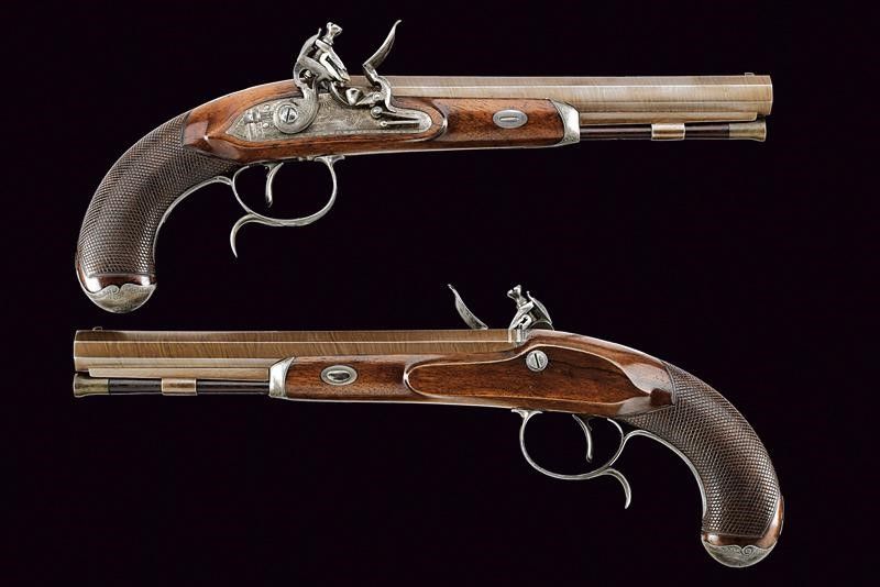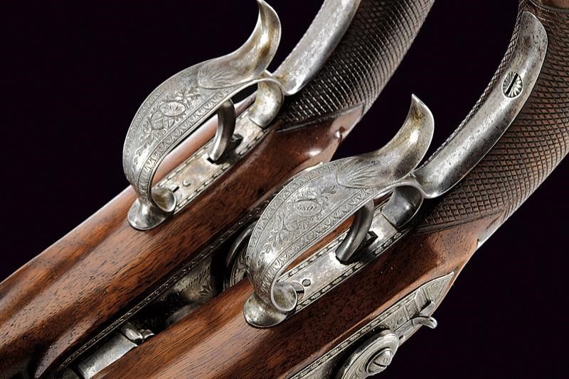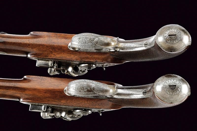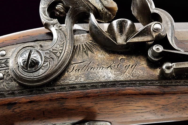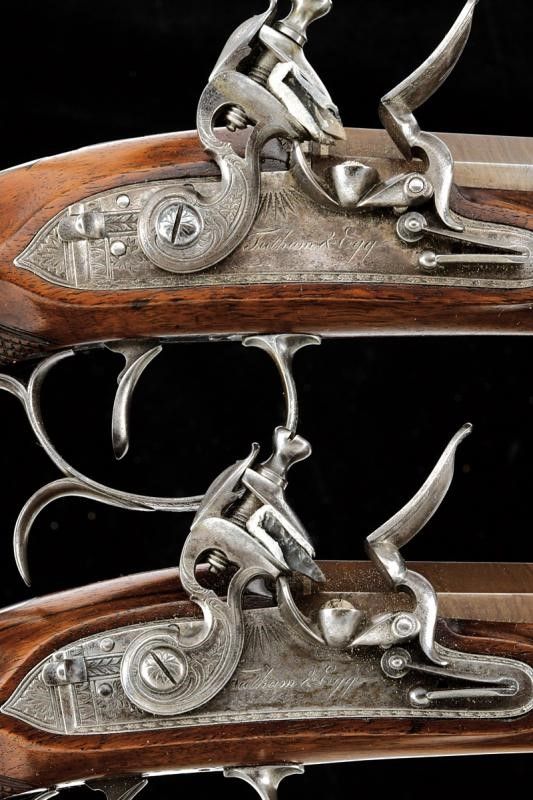 Canne lisce ottagonali con resti di brunitura, marcate al dorso con un punzone rimesso in argento recante iscrizione 'TATHAM & EGG', recanti cornicetta ageminata in argento in culatta, in volata cal. 14,5 mm. (.57). Le anime pulite, in buono stato di conservazione. Codoli delle canne con incisioni floreali e alzo fisso. Batterie a cartella piatta con bordi scantonati e incisi a cornicette; le codette ribassate e dotate di sicura esterna. I cani a collo di cigno con rinforzo alla ganascia inferiore. Martelline con rotellina antifrizione. Entrambe le meccaniche ben funzionanti. Casse a tre quarti in noce con impungatura zigrinata. Fornimenti in ferro. Ponticelli recanti trofei incisi, cornicette e muniti di poggiadito. Cocce incise en suite. Bacchette in legno con battipalla in ferro. Una munita di cavastracci, una con sforatura per avvitare altri strumenti. Conservate in una cassetta di produzione più tarda (XX secolo) completa di alcuni accessori.