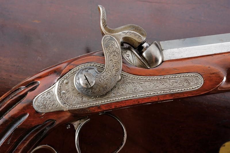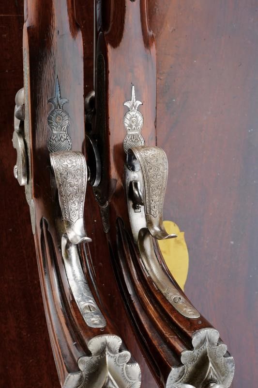 Liegi, lunghezza 41 cm. Canne ottagonali rigate firmate 'N VIVARIO PLOMDEUR ARQ.R DU ROI A LIEGE', con culatta incisa a fiorame, recanti su un lato il punzone del banco di prova di Liegi, munite di mirino, cal. 12 mm; codette incise a fiorami. Batterie a molla in avanti incise en suite. Casse in radica scolpite alla bocca a racemi e scanalate al calcio. Ponticelli con poggiadito in ferro, cocce cuspidate ed incise; stecher. Nella loro cassetta di legno foderata internamente di velluto rosa, munita di tutti gli attrezzi e della chiave.