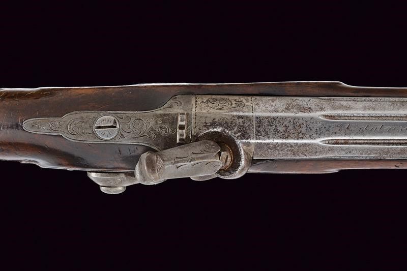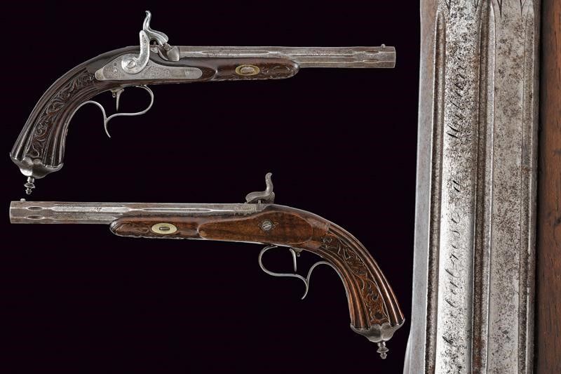 Canne ottagonali rigate (anima da pulire, rigatura visibile), strutturate a settori decorati a scanalature e incisioni, con resti di una firma, mirino di precisione, cal. 11.4 mm. Codette incise a motivi floreali e dotate di alzo. Batterie a luminello a molla in avanti, cartelle piatte ed ornate da incisioni a racemi, codoli ribassati. Mezze casse in legno con musi e calci scolpiti, i primi a motivi floreali e i secondi anche con scanalature. Fornimenti in ferro incisi en suite con le batterie, ponticelli con poggiadito, cocce prolungate con estremità a trottola. Grilletti con sensibilizzatore. Meccanica funzionate ma da rivedere.