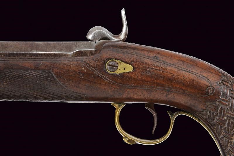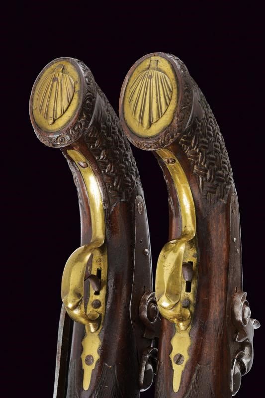 Italia meridionale, lunghezza 34.5 cm. Canne lisce ottagonali decrescenti verso la volata, cal. 16.7 mm. Lunghissime ed inusuali codette lavorate a bande oblique, munite di traguardo. Batterie a molla indietro con cartella liscia. Casse in legno con calci scolpiti e astine zigrinate. Fornimenti in ottone, cocce con scomparto portacapsule. Bacchette in ferro. Una pistola con gancio da cintura.