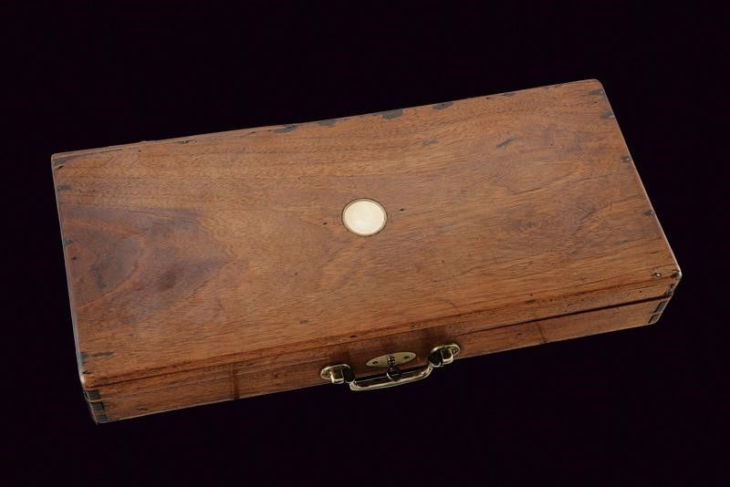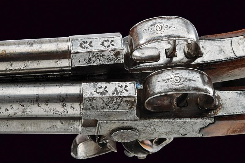 Londra, lunghezza 25.7 cm. Canne rigate (anime pulite, rigatura ben visibile, una in condizioni migliori dell'altra), sovrapposte, tonde, incise alla volata, cal. 13 mm; castelli firmati 'WHEELER' e 'LONDON', incisi a trofei. Zone con danni da ruggine. Cani dorsali muniti di sicura. Sul lato sinistro selettore di canna. Calci in legno. In una cassetta di legno rifoderata internamente in velluto verde e munita di diversi attrezzi. Completa di chiave.