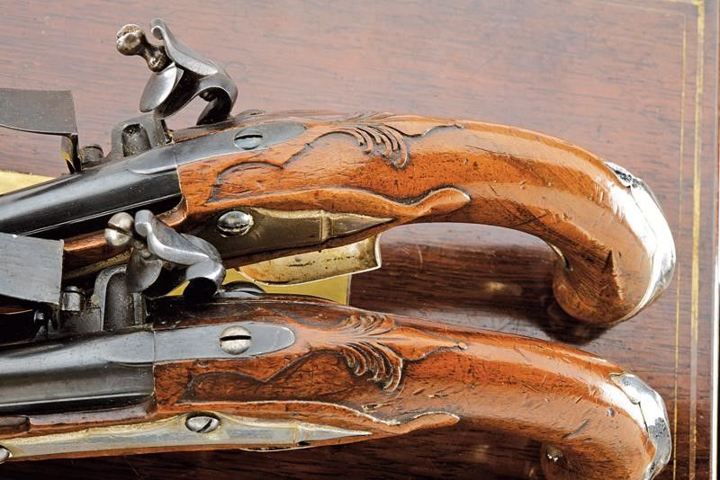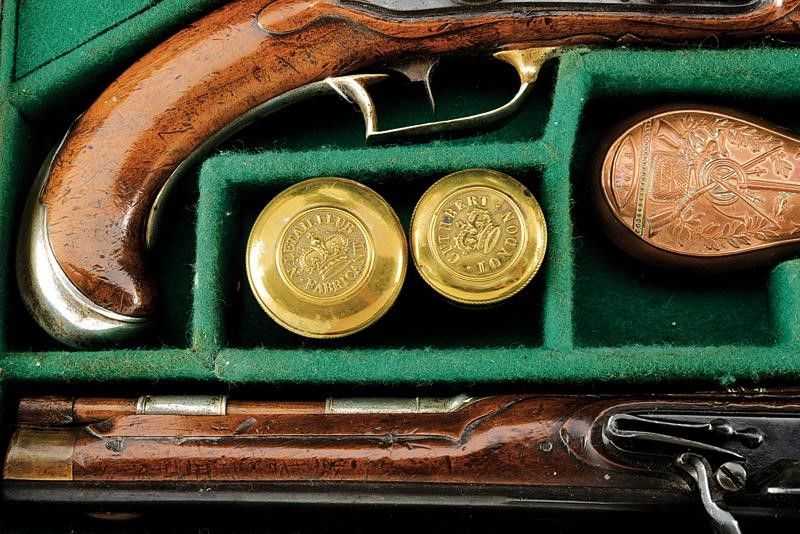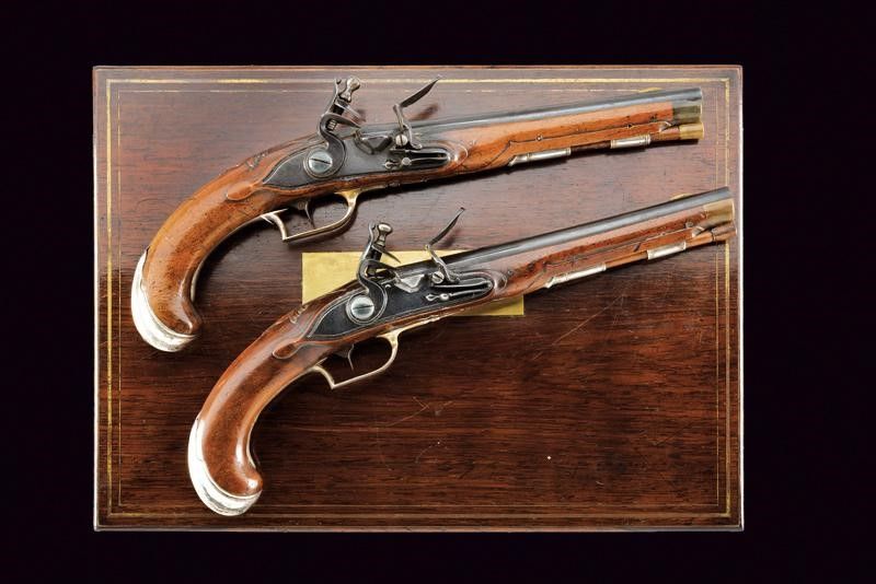Germania, lunghezza 36.5 cm. Canne lisce tonde, con base quadra, bindella dotata di mirino in ottone, cal. 12 mm; batterie a pietra focaia con brunitura rinfrescata come anche sulle canne. Casse intere in legno leggermente intagliate, con muso in corno e fornimenti lisci in argento. Bacchette in legno con battipalla in corno. In casetta di legno con fodera interna in panno verde (di epoca successiva) munita di diversi accessori.
