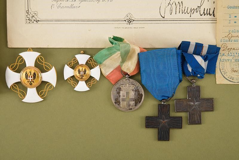 Prima metà del XX Secolo Medaglia d'argento al Valore Civile, completa di diploma di conferimento del 1943. Due decorazioni (cavaliere e commendatore?) dell'ordine della Corona d'Italia, dorate e smaltate, insieme con una lettera del 21 maggio 1946, indirizzata all'interessato, del ministero della Reale Casa nella quale gli viene annunciato il conferimento da parte di re (Umberto) del grado di Grand'Ufficiale della Corona d'Italia. Croce di Guerra al Valor Militare, con diploma di conferimento del 1943. Un'altra Croce al Merito di Guerra con diploma, conferita nel 1946. Insieme con la ricevuta di una medaglia più antica (anni 20) non presente. Un ritratto autografato di Umberto di Savoia, con dedica a Pasquale Soria, datata 1936, in cornice coeva e sotto vetro. Inoltre un nastrino con mignon in cui è presente la miniatura della placca di Grand'ufficiale della Corona d'Italia, il mignon della medaglia d'argento al valore civile, il mignon del Valore Militare in bronzo e altri mignon di cui sono presenti anche tutte le medaglie. Una terza croce al valore militare VEIII.