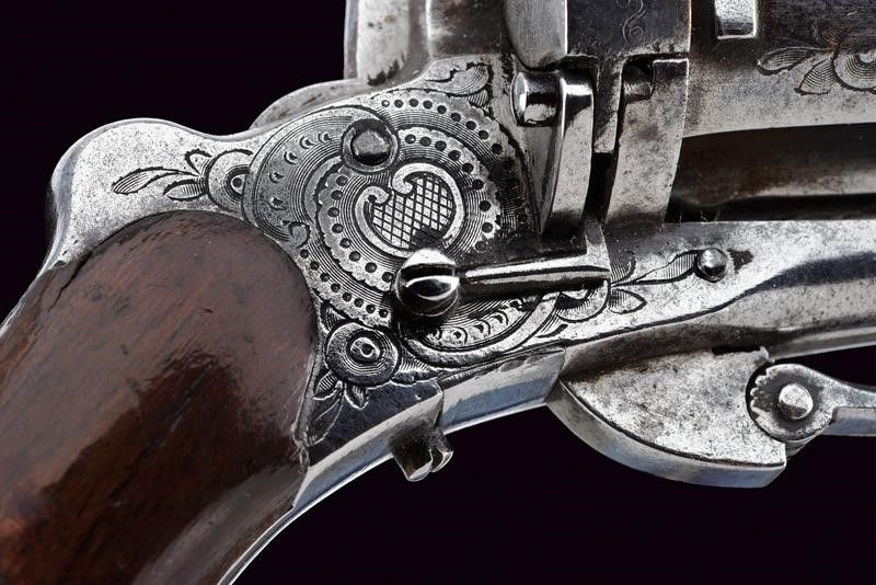Belgio, lunghezza 26.5 cm. Canna tonda, liscia, cal. 9 mm; tamburo scanalato a sei colpi incisi a rocaille e motivi floreali, punzone del banco di prova di Liegi. Castello liscio decorato en suite. Sportellino di caricamento e grilletto pieghevole. Guancette in legno, nel calcio la bacchetta. Meccanica funzionante.
