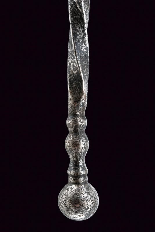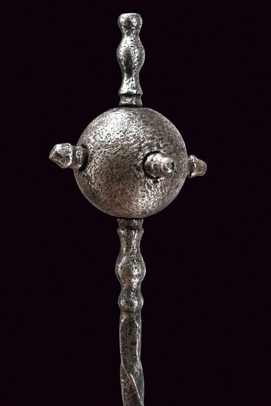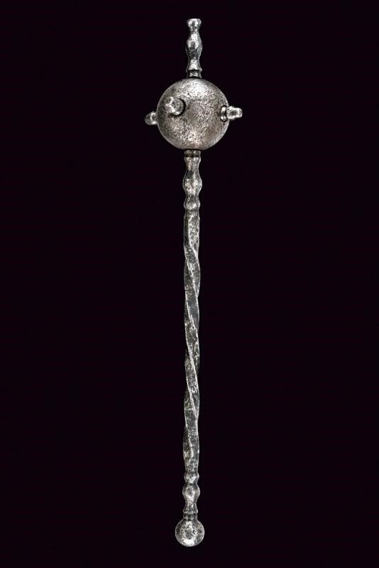 XVI/XVII secolo Testa sferica in ferro munita di quattro borchie poste sull'equatore e una di maggior lunghezza posta alla sommità . Fusto tortile con estremità a bottone. Molto rara.