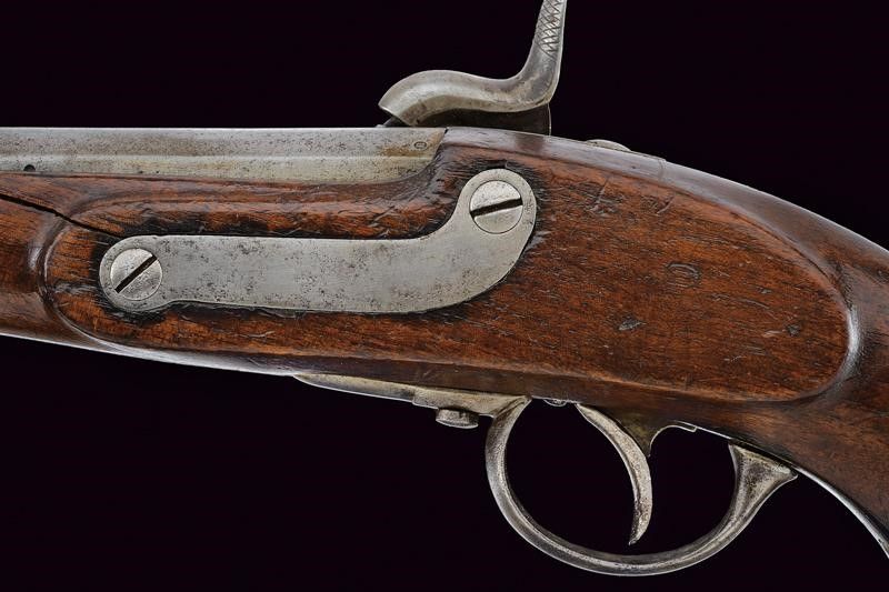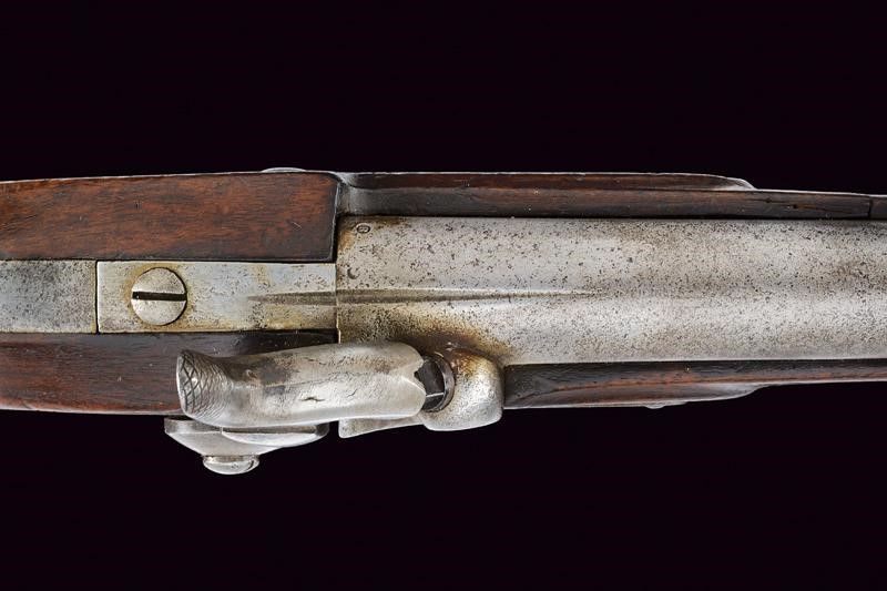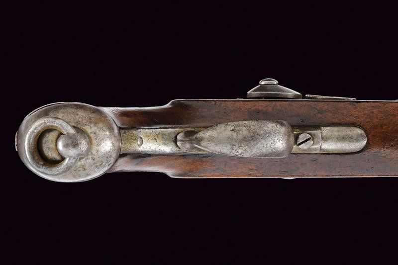 Canna tonda rigata con base quadra e scanalata, avente punzoni 'R' e 'W, mirino, cal. 13. 9 mm. Batteria datata '863' e con punzone imperiale. Cassa in legno con fornimenti e anello di sospensione in ferro.
