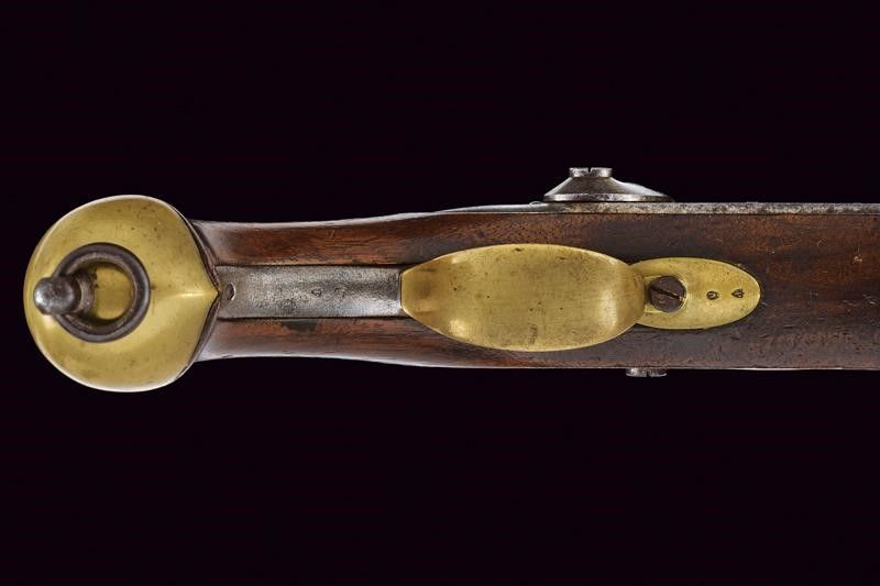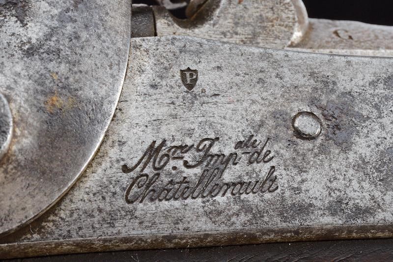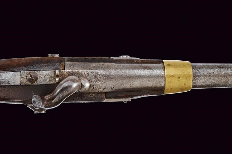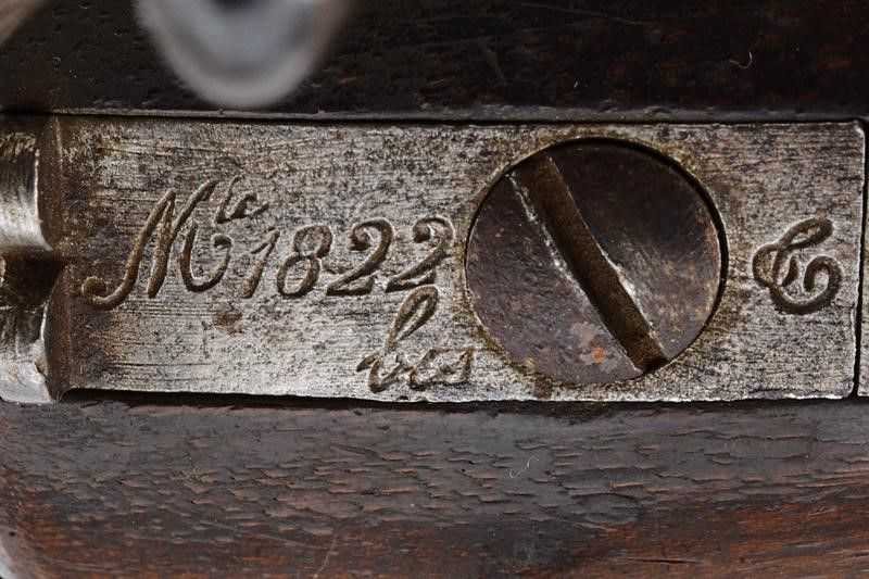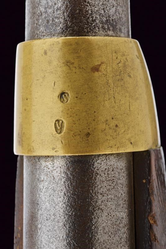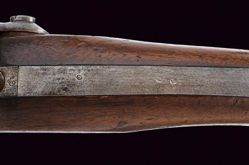 Canna tonda rigata, con culatta ottagonale marcata 'DE 17 - 6AN', 'M' e 'L' entro ellissi, datata 'G. 1836' sul lato destro e marcata 'M I', dotata di mirino, cal. 17,5 mm. Il codolo con tacca di mira e marcatura del modello 'M.le 1822 T Bis'. Batteria marcata 'M.re Imp.le de Chatellerault' e con punzone 'P' entro scudetto. Meccanica funzionante. Cassa a tre quarti in legno con qualche segno d'uso, sul fianco sinistro bollo 'MI', timbro 'St. ETIENNE' e 'D' sotto corona. Fornimenti in ottone con vari punzoni. Bacchetta in ferro. Anello di sospensione.