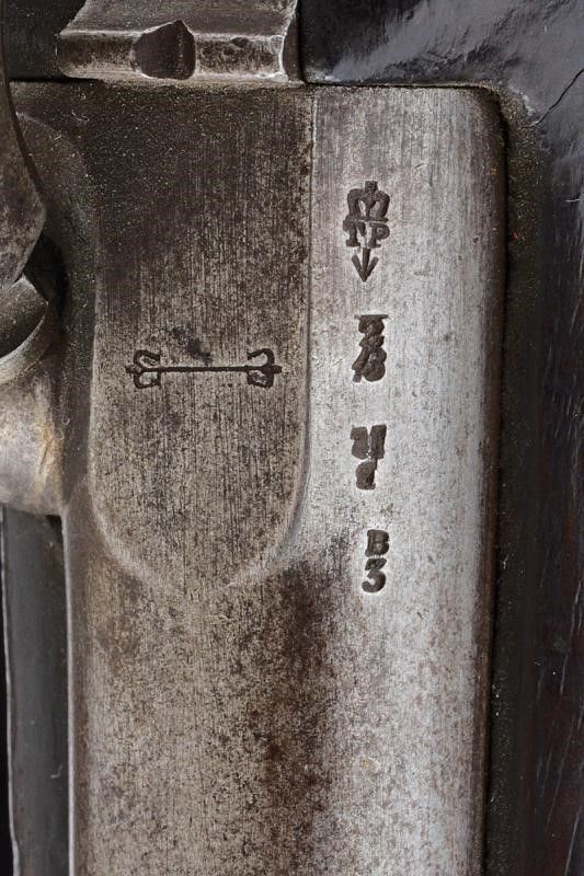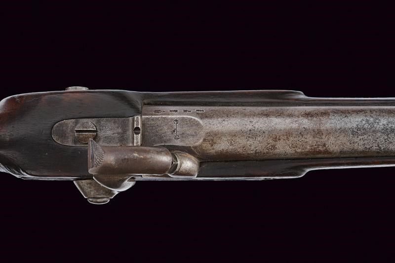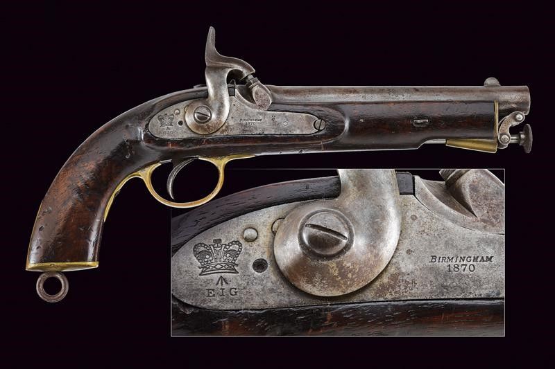 Birmingham, lunghezza 36 cm. Canna tonda liscia, con breve bindella alla base recante vari punzoni; mirino, cal. 15 mm. Codetta con alzo. Batteria a molla in avanti marcata 'EIG' sotto corona e '1870 BIRMINGHAM'. Cassa intera in legno con timbro 'WD' e 'ISAAK HOLLIS SONS'. Fornimenti in ottone, la bacchetta a snodo e l'anello di sospensione in ferro.