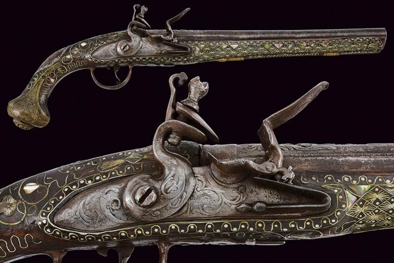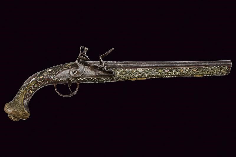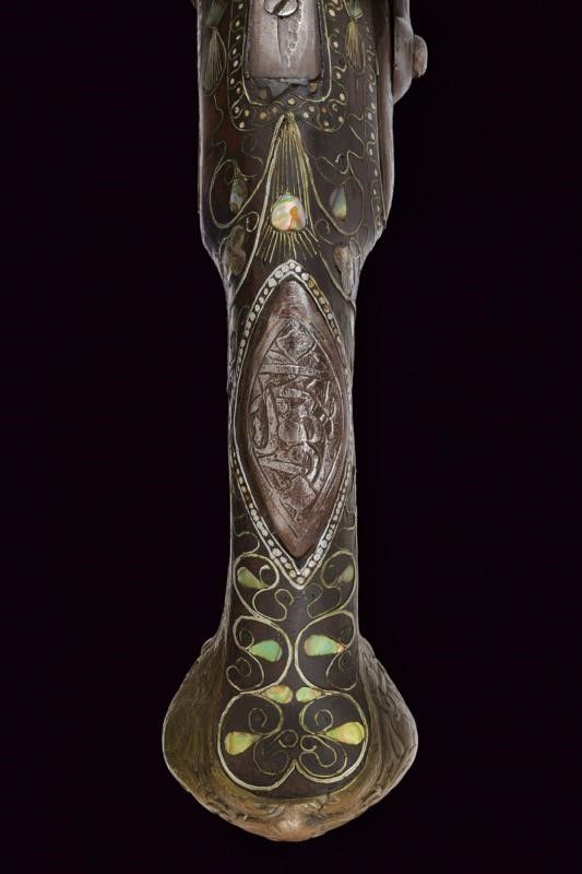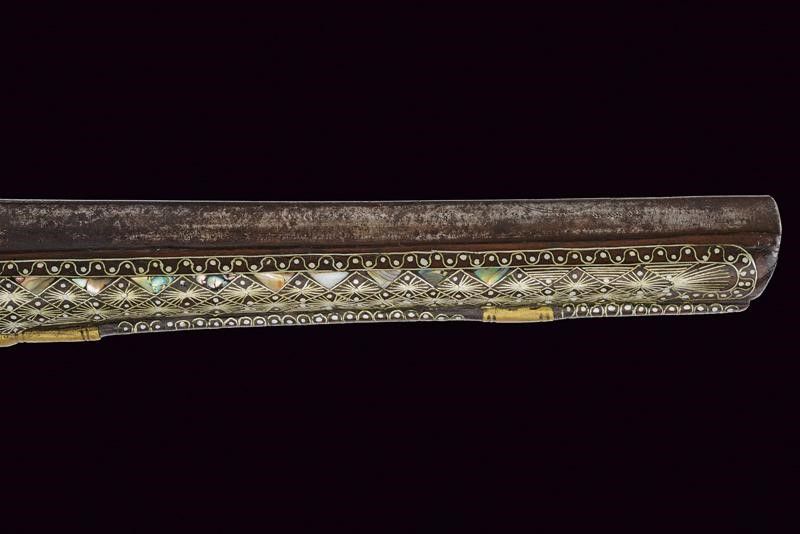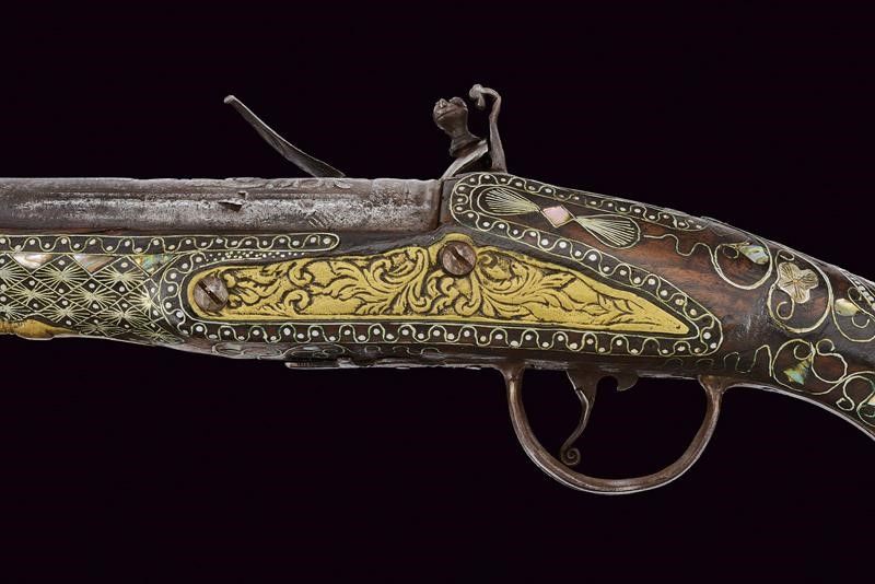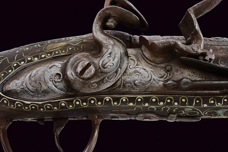 Turchia, lunghezza 47,5 cm. Prima metà del XIX Secolo Canna in ferro liscia, tonda, con volata leggermente strombata e con intagli floreali alla base e una bindella che si abbassa progressivamente verso la volata; la culatta con anellature e resti di incisioni. Cal. 16 mm. Codolo con traguardo a sella. Batteria a pietra (produzione eruopea settecentesca?) con cartella tondeggiante recante resti di intagli a racemi. Meccanica dura ma funzionante. Cassa in legno di produzione orientale con tipica bacchetta finta integrata. La superficie riccamente ornata con agemine in metallo color argento a motivi geometrici, alternate a tarsie in madreperla. Ponticello in ferro. Coccia in ottone con mascherone e fiorami. Contropiastra in ottone con decoro floreale. Scudetto dorsale in ferro con intaglio (forse a caratteri islamici).