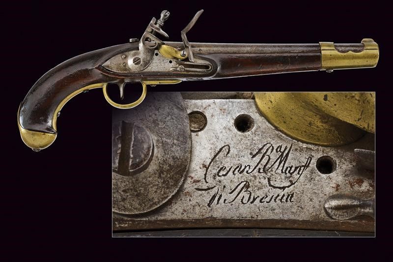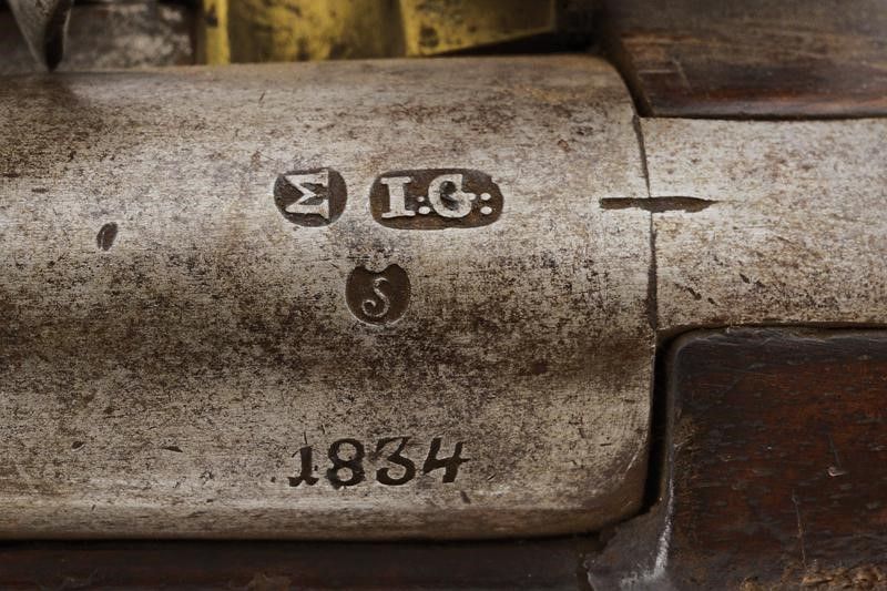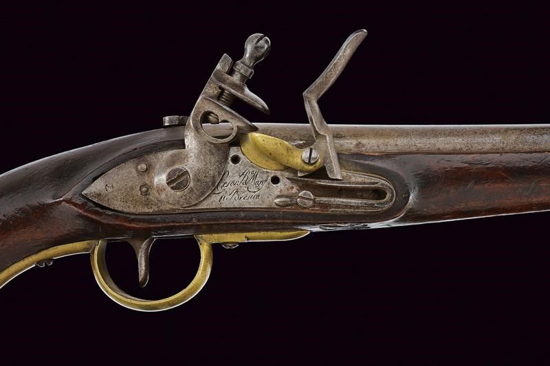 Austria, lunghezza 43 cm. Canna liscia tonda, con base quadra, marcata e datata 'I.G:', 'M' e '1834', cal. 17 mm. Batteria a pietra focaia con firma della manifattura di Brescia e con scodellino in ottone. Cassa intera in legno marcata sotto alla batteria '2M2' e con fornimenti in ottone, la contropiastra in ferro. Piccoli difetti.