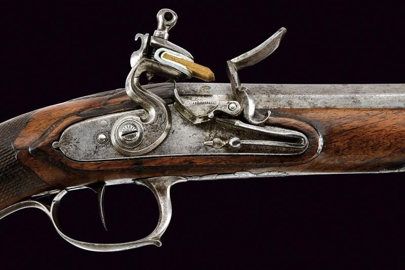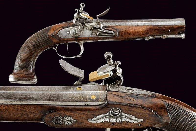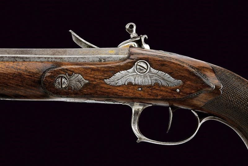 Canna ottagonale liscia, con triplice marca di Leclerc in oro, punzone laterale 'M' coronato, marcatura 'CANON TORDU', mirino, volata leggermente strombata, cal. 18 mm. Codolo inciso e dotato di alzo. Batteria a cartella piatta, con sobrie incisioni a motivi floreali. Cassa intera in noce (piccolo tassello riattaccato), con impugnatura zigrinata e liste perlinate attorno alla batteria e dal lato della contropiastra. Fornimenti in ferro incisi in stile impero, la coccia con iniziali 'PB', bacchetta in ferro con cavastracci.