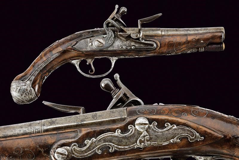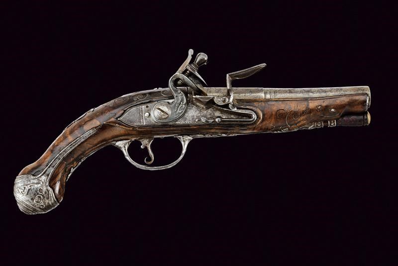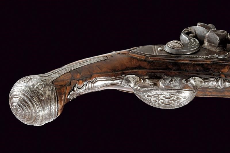 Europa, lunghezza 24 cm. Canna liscia a due ordini, ottagonale e tonda, con incisioni a volute nel primo segmento, anellatura al cambio, intaccature, in volata cal. 12,6 mm. Batteria a cartella piatta con margine ribassato, cane con intagli a fiorami e rocaille sul collo. Meccanica funzionante ma molla un po' indebolita. Cassa intera in legno con vecchia riparazione nel segmento anteriore e altri restauri. Varie agemine in filigrana a volute e ricci. Fornimenti in ferro ornati a fiorami e rocaille in rilievo. Qualche segno del tempo. Bacchetta in legno con battipalla in ottone.