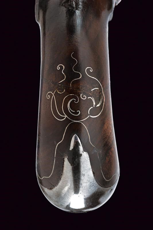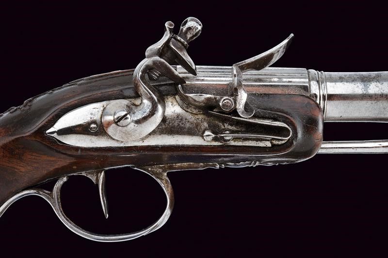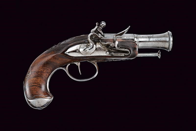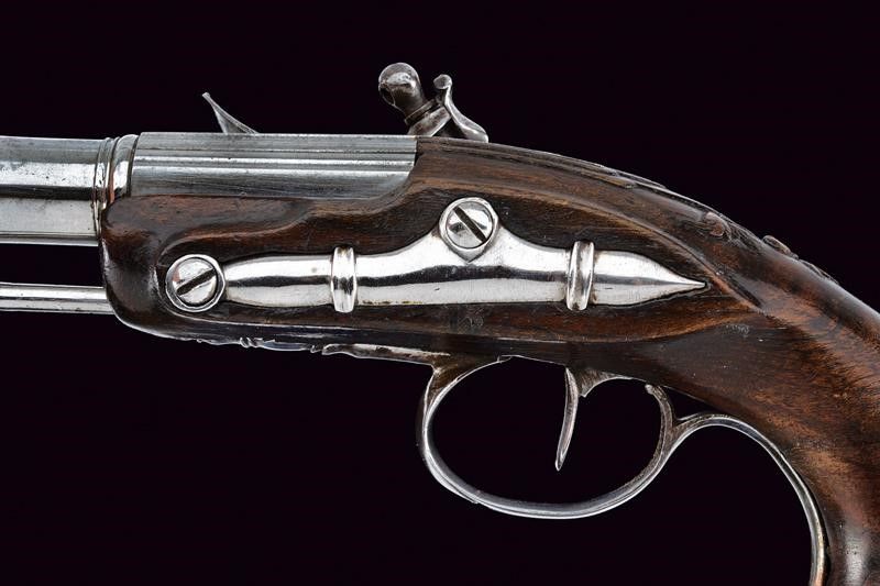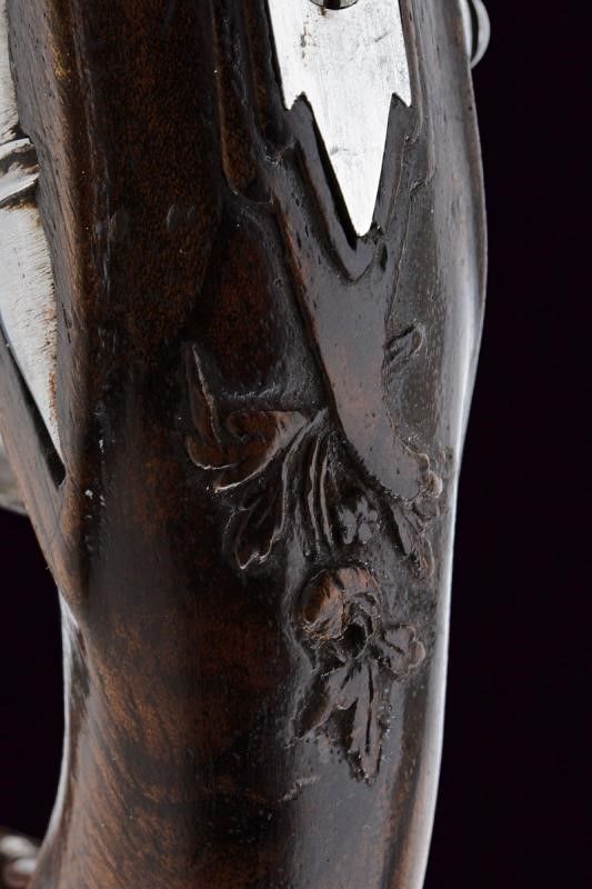 Francia, lunghezza 19 cm. Canna liscia a due ordini, ottagonale nella prima parte, decorata da scanalature longitudinali, poi tonda, con anellatura al cambio e con volata a strombatura circolare. Batteria a pietra focaia con cartella tondeggiante. Cassa in legno (crepa al collo) scolpita attorno alla codetta a motivi floreali, alcune tarsie in filigrana. Fornimenti e bacchetta in ferro.