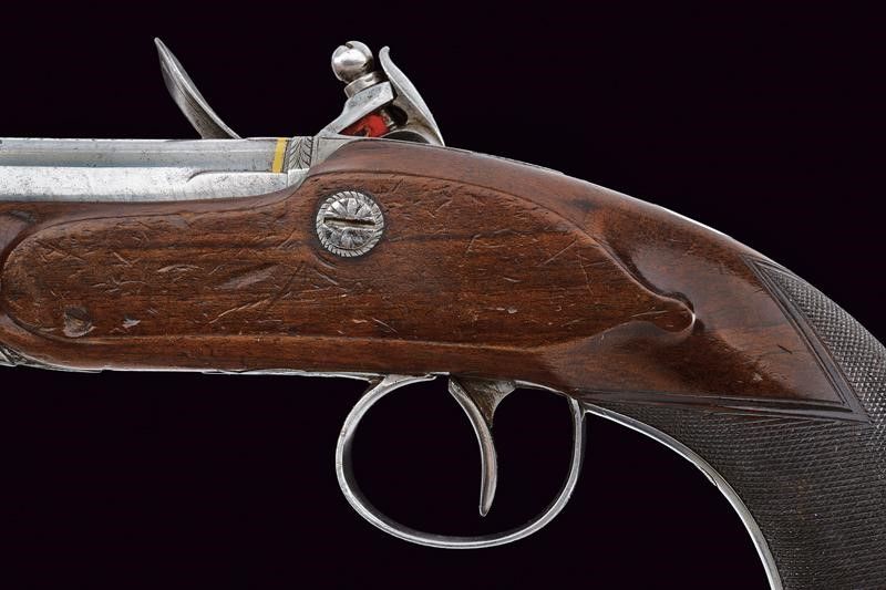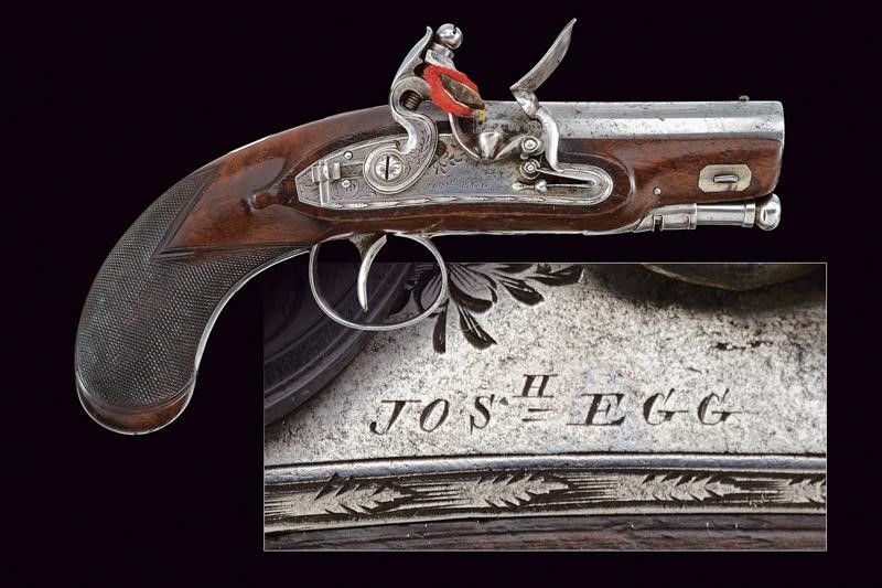 Londra, lunghezza 18 cm. Canna tonda liscia con base quadra e breve bindella, marcata 'LONDON'; la prima parte con cornice e banda in oro, in seguito incisioni a motivi floreali e mirino, cal. 12 mm. Codetta incisa e munita di alzo. Bella batteria a pietra focaia firmata 'JOS.H EGG' ed incisa a motivi floreali, munita di sitema antifrizione, a tenuta stagna e con sicura. Cassa intera in legno con calcio zigrinato, ponticello in ferro inciso, sul dorso scudetto in argento. Bacchetta in ferro.