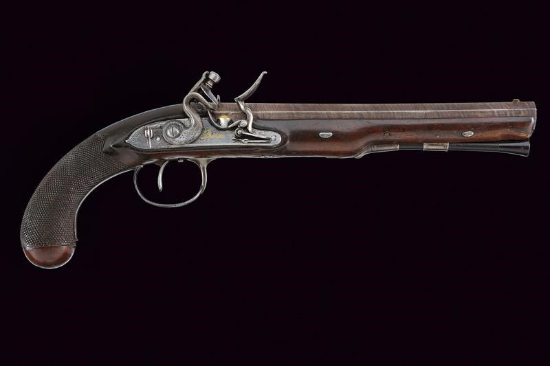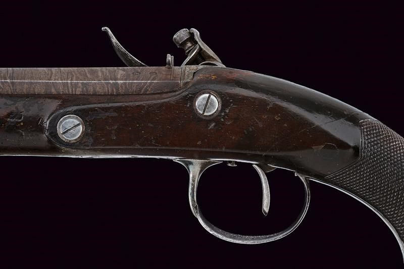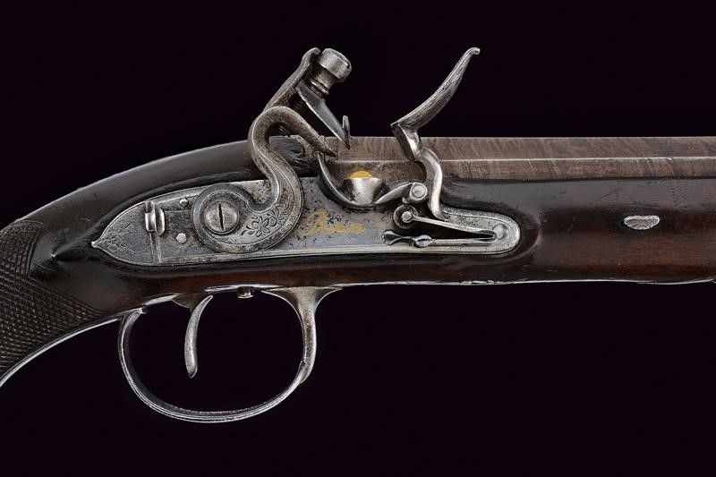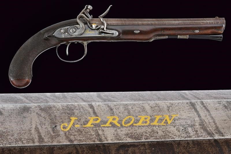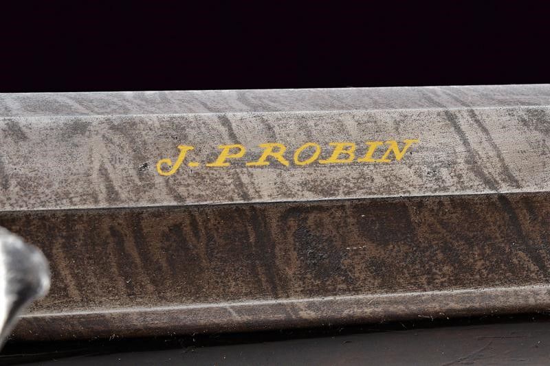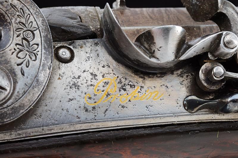 Canna liscia ottagonale, brunita, damascata, firmata 'J. PROBIN' in oro, recante alla base cornice incisa e alzo, due punzoni cerchiati 'P' e 'V'; la sezione della canna leggermente rastremata verso la volata, questa dotata di mirino, cal 15.5 mm. Codetta incisa a motivi floreali. Batteria con cartella (leggero pitting) firmata 'Probin' in oro, codolo ribassato con fiore inciso, munita di sistema antifrizione, a tenuta stagna e con sicura; focone foderato in oro. Cassa in legno (restauri al collo) con calcio zigrinato. Fornimenti in ferro incisi. Bacchetta in legno con battipalla in corno.