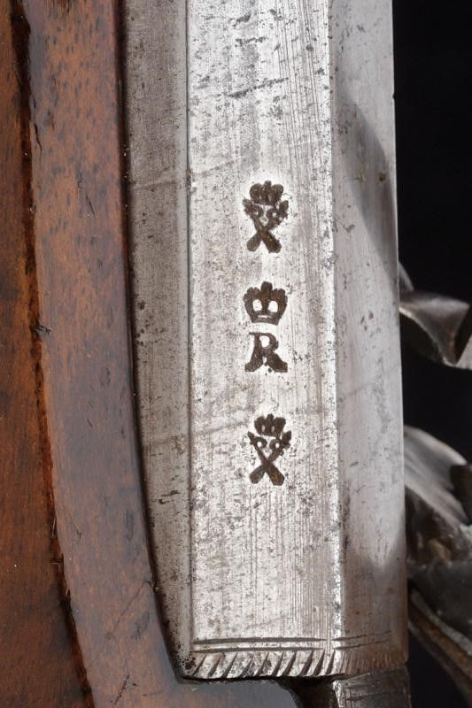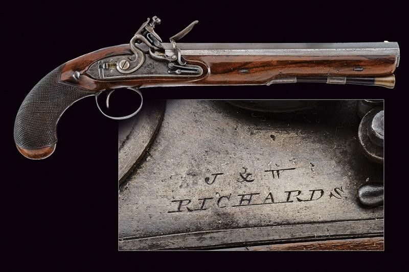 Londra, lunghezza 40 cm. Canna liscia ottagonale marcata 'LONDON' e con punzoni del banco di prova, mirino in argento, cal. 19 mm. Codolo inciso e munito di alzo. Batteria a pietra con firma 'J&W RICHARDS' e codetta leggermente incisa e ribassata, munita di sistema antifrizione, a tenuta stagna e con sicura. Cassa in legno, calcio zigrinato. Fornimenti in ferro incisi. Dorso con scudetto ellittico in argento. Bacchetta in legno con battipalla in metallo.