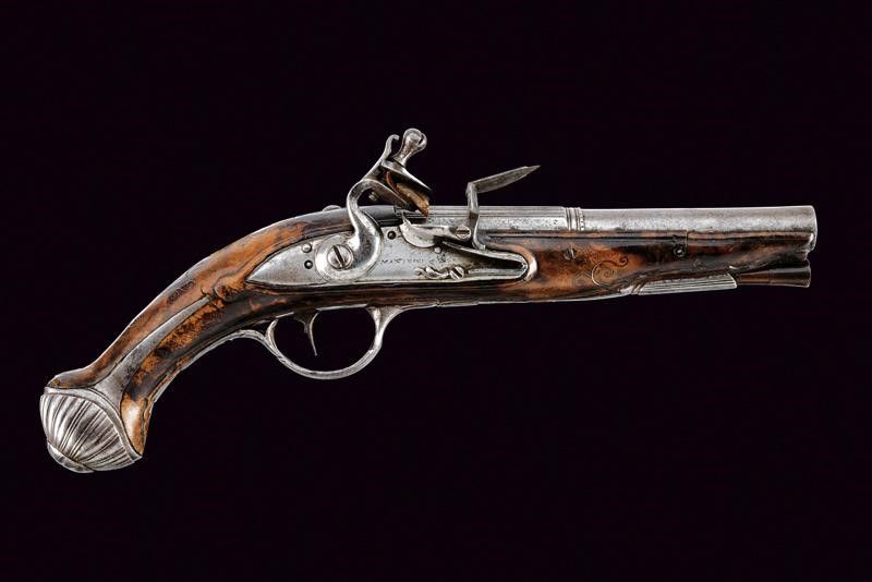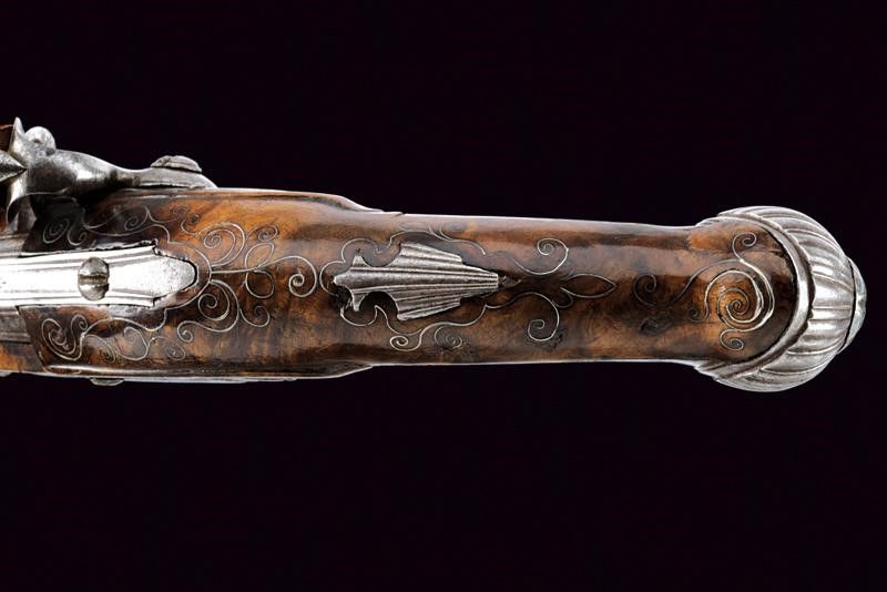 Brescia, lunghezza 26.5 cm. Canna liscia a due ordini, prima ottagonale e nervata, recante la firma 'LAZARO LAZARINO' poi tonda con un anelleatura liscia e una perlinata al cambio; cal. 12 mm. Codetta nervata. Batteria a pietra focaia firmata 'MARTINONI'. Cassa intera in radica (piccoli danni) leggermente scolpita e con tarsie in filigrana. Fornimenti in acciaio intagliati a scanalature. Bacchetta in legno con battipalla in corno. Meccanica funzionate.