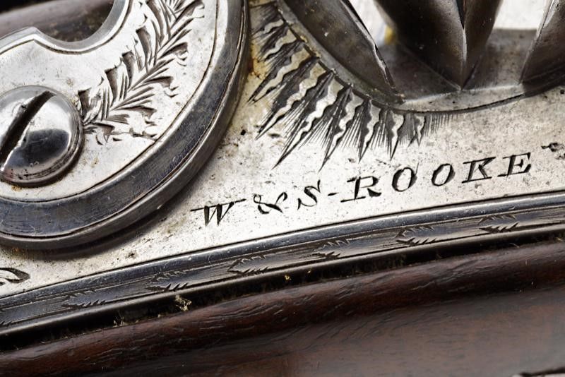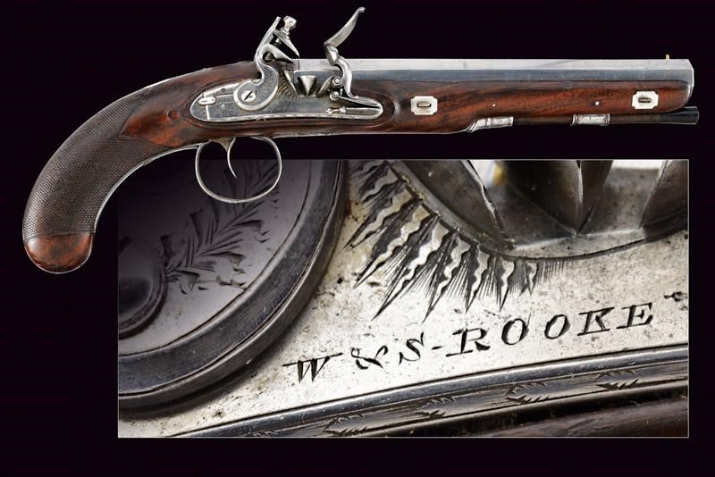 Cheltenham, lunghezza 38.5 cm. Canna liscia ottagonale con incisione 'CHELTENHAM', dotata di culatta con doppia cornice incisa, volata con mirino, cal. 14 mm. Codetta incisa e munita di alzo. Batteria a pietra focaia firmata 'W&S ROOKE', finemente incisa e munita di sistema antifrizione, a tenuta stagna e con sicura. Cassa intera in legno con calcio zigrinato. Fornimenti in ferro inciso. Bacchetta in legno con battipalla in corno.