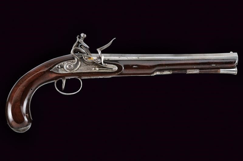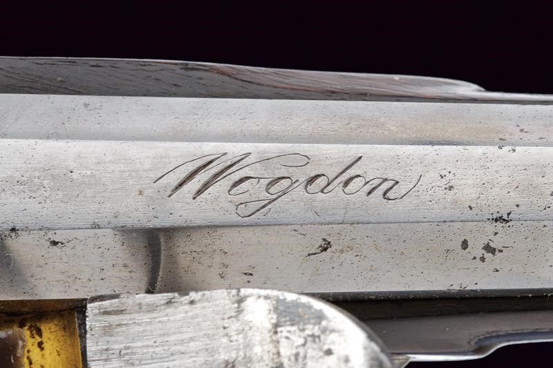 Londra, lunghezza 38.5 cm. Lunga canna liscia ottagonale con cornice alla base firmata 'Wogdon', mirino in argento, cal. 14 mm. Codetta incisa e munita di alzo. Batteria a pietra focaia firmata 'Wogdon' munita di sicura. Cassa intera in legno (piccoli difetti) con fornimenti in ferro inciso a motivi floreali. Bacchetta in legno con battipalla in ferro.