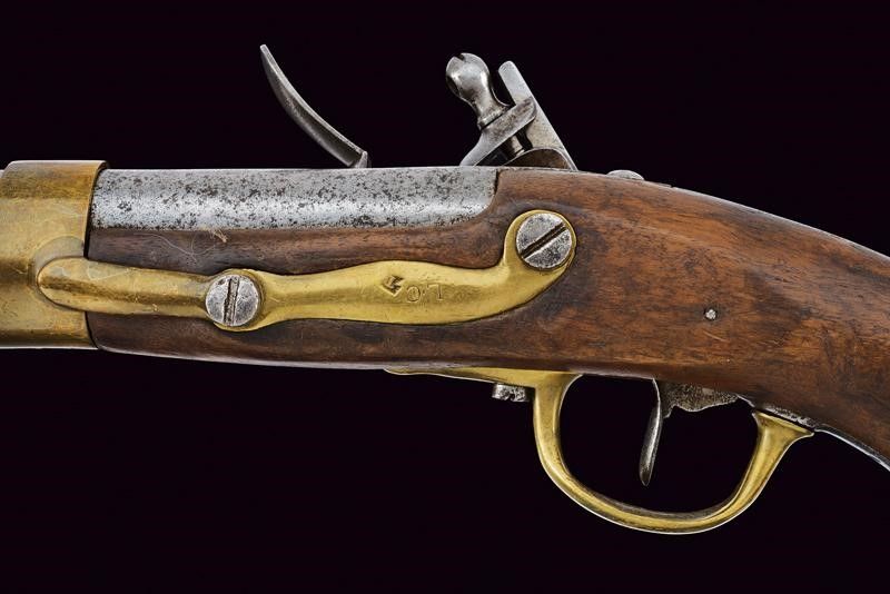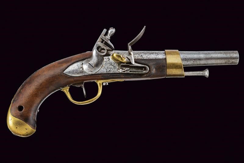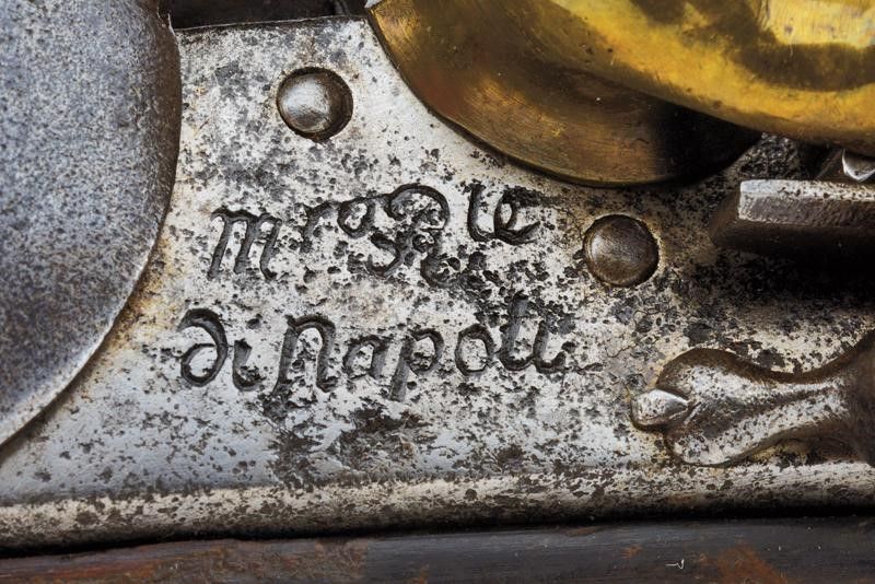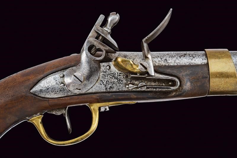 Regno delle Due Sicilie, lunghezza 35 cm. Canna tonda liscia con culatta ottagonale, cal 19 mm. Batteria marcata 'M.ra R.le di Napoli', datata all'interno '1825' e con punzone e 'NH'. Meccanica funzionante. Scodellino in ottone. Cassa in legno a tre quarti con lievi mancanze e restauri. Ponticello in ottone con punzone 'F', coccia in ottone, banda dorsale in ferro. Contropiastra in ottone marcata 'L.C.T.' Bocchino con punzone non chiaramente leggibile. Un po' di intaccature sulle parti in ferro. Sforatura nell'impugnatura, probabilmente praticata in epoca d'uso per inserimento di un correggiolo. Bacchetta in ferro.