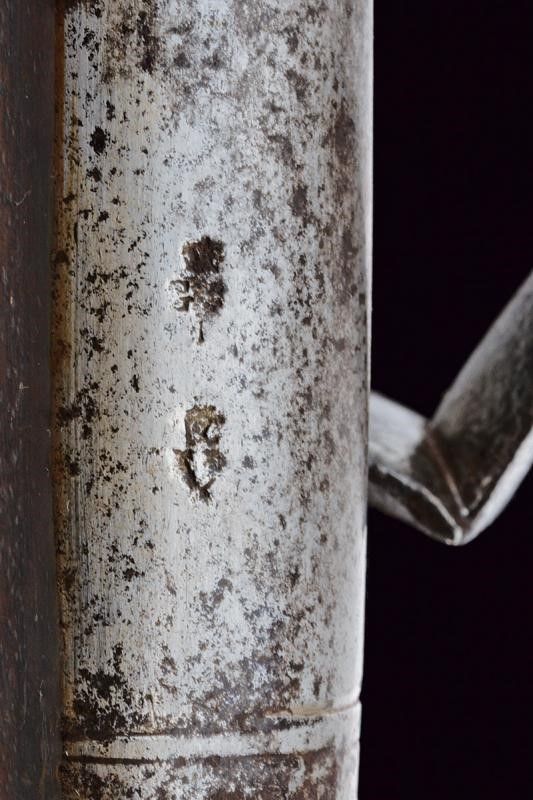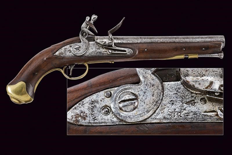 Canna tonda liscia con anellatura di rinforzo in culatta, lunga 9', cal. 17,1 mm. in volata. Resti di due punzoni non chiaramente leggibili. Batteria a cartella piana con corona sormontante le iniziali 'GR' (Giorgio III o Giorgio IV), punzone 'broad arrow' sormontato da corona e 'TOWER' sulla codetta. Meccanica funzionante. All'interno 'NM' e '3' sormontato da corona. La meccanica in stato di conservazione migliore rispetto all'esterno. Cassa intera in legno con piccola riparazione sotto alla volata. Fornimenti in ottone. Bacchetta in ferro. Sul tipo del raro '1805 Pattern Short Sea Service'.