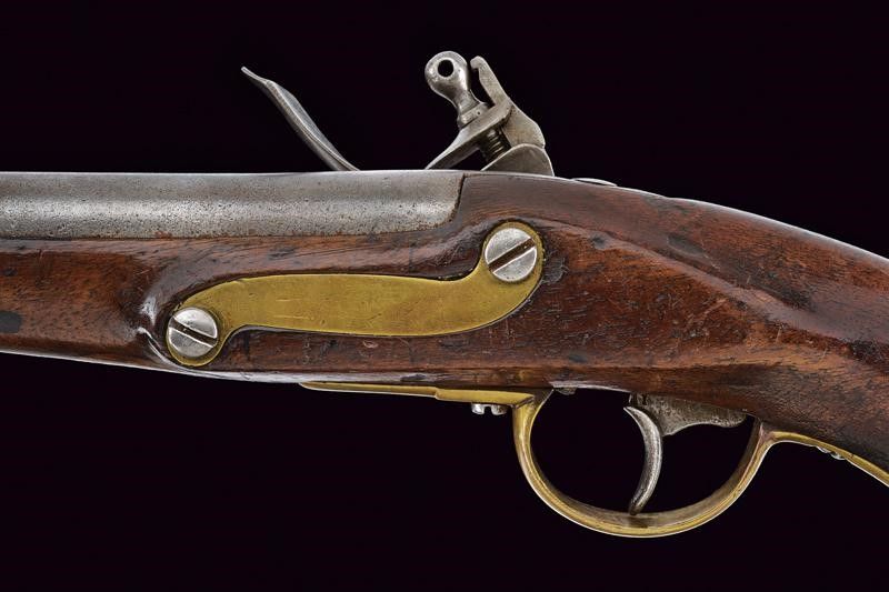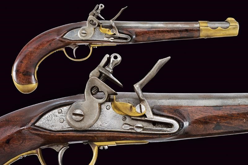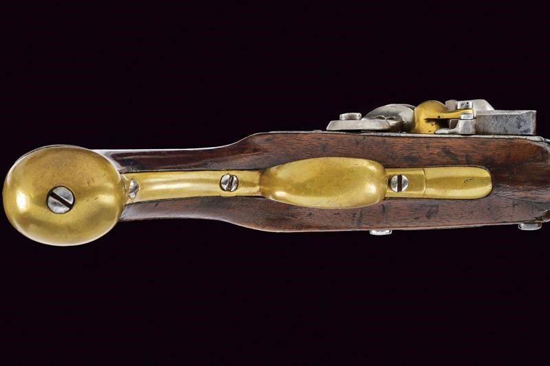 Austria, lunghezza 43 cm. Canna tonda liscia, con base quadra, cal. 17.6 mm; codetta liscia con punzone imperiale; batteria a pietra focaia con scodellino in ottone. Cassa intera in legno (piccolo restauro vicino alla coccia) e fornimenti in ottone. Meccanica da rivedere.