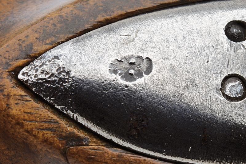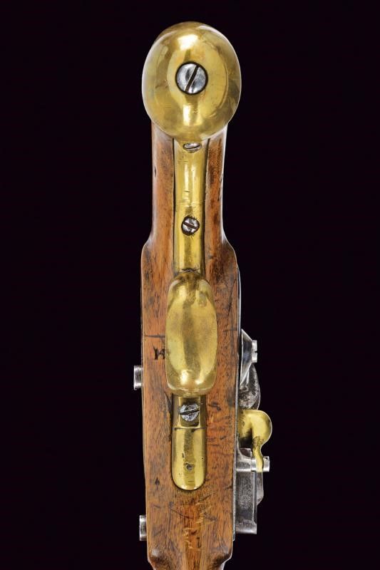 Canna tonda liscia, con base quadra e marcata, 'A', '1834' e 'S' sul fianco, cal. 17.6 mm; codetta marcata '1834'. Batteria a pietra focaia, marcata anche questa '1834', punzonata 'C' e con aquila imperiale; scodellino in ottone. Cassa intera in legno (piccola crepa) con vari timbri e con fornimenti in ottone.