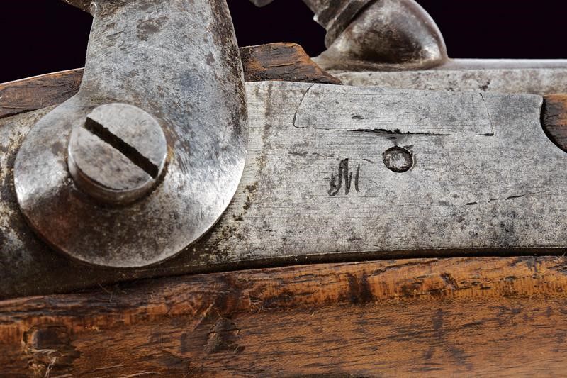 Stato Pontificio, lunghezza 24 cm. Canna liscia tonda con culatta ottagonale marcata con numero '214', 'M.B' e con un altro punzone poco visibile, cal. 15 mm. Codetta con numero '71'. Batteria ridotta a luminello con resti di marcatura 'GM' per Mazzocchi (la lettera G poco visibile). Cassa in legno (stessa matricola, piccoli difetti) con fornimenti in ottone e bacchetta in ferro.
