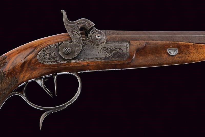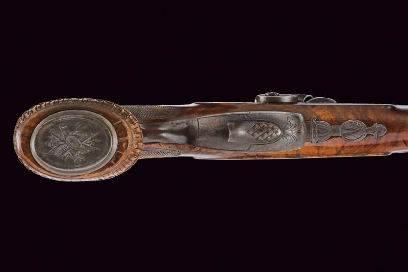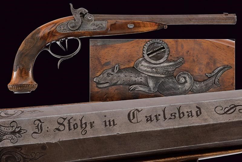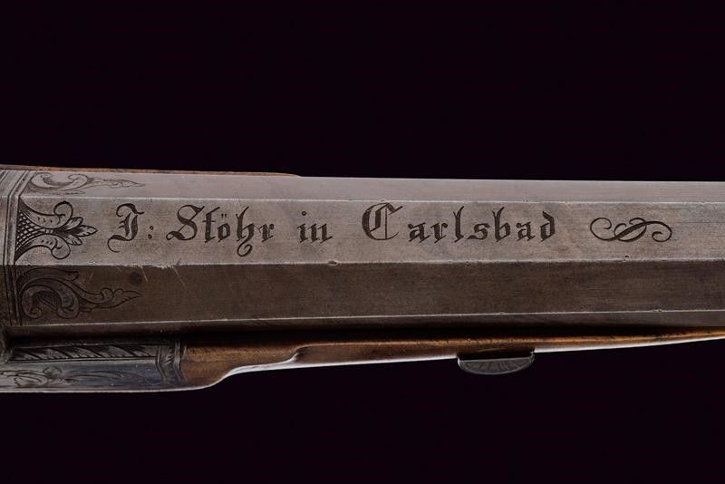 Baden, lunghezza 43 cm. Canna ottagonale con lieve microrigatura, recante resti di brunitura probabilmente antica, firmata al dorso 'J. STÖHR IN CARLSBAD', incisa alla base a fiorami e con cornicetta in volata, dotata di mirino, cal. 11,2 mm. in volata. Culatta incisa a rocaille. Codolo numerato '2' e munito di alzo fisso. Batteria a molla in avanti con cornicetta incisa sulla piastra e fiorami, presenti anche al collo del cane. La testa del cane incisa con volto grottesco. Cassa a tre quarti in legno con collo zigrinato. Il muso con intaglio a palmetta e riccio. Fornimenti in ferro. Bella contropiastra sagomata e incisa a effigiare un drago. Coccia piana ellittica (leggermente lasca) recante trofeo inciso. Ponticello con poggiadito e incisioni floreali. Grilletto e stecher ben funzionanti. Vite di regolazione.