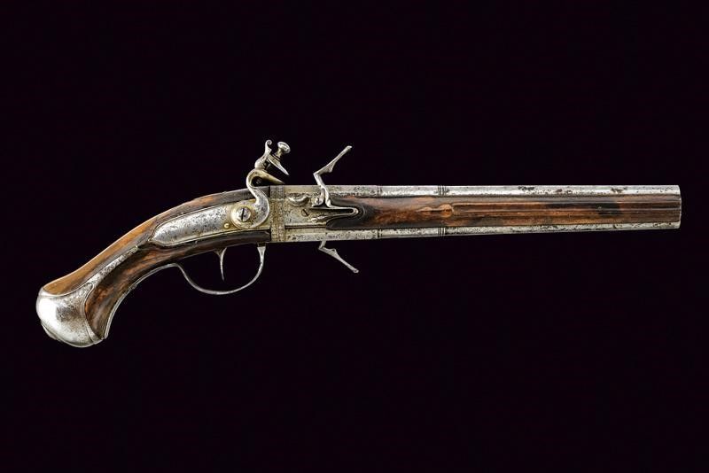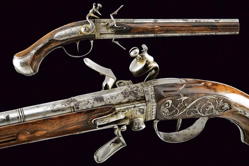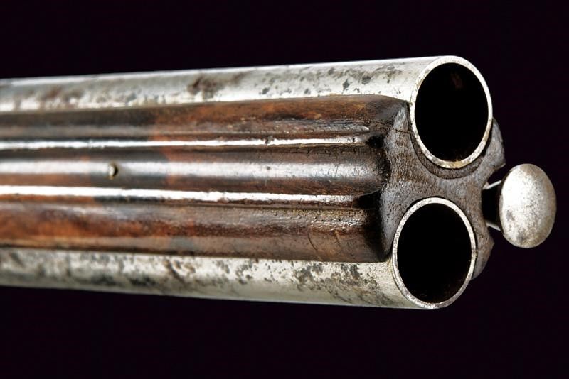 Canne lisce a tre ordini, prima ottagonali, poi entrambe con doppio segmento circolare e triplice anellatura al secondo cambio; in volata cal. 12 mm. Anima da pulire all'interno. Le due canne montate sul blocco ruotabile anteriore; questo può essere sbloccato premendo il ponticello, ed è munito di due scodellini e martelline. Lo snodo di rotazione e il blocco ben funzionanti. Batteria con cane a collo di cigno inciso a grottesche e fiorami. La cartella lievemente tondeggiante e con bordino rilevato, anche questa incisa a fiorami. La cassa composta in due segmenti, il calcio e l'astina posti fra le due canne, entrambi con qualche segno d'uso e del tempo. Fornimenti in ferro. Alcune intaccature. Bella contropiastra lavorata a traforo a racemi. Su un lato, fra le due canne, la bacchetta in legno con battipalla in ferro.