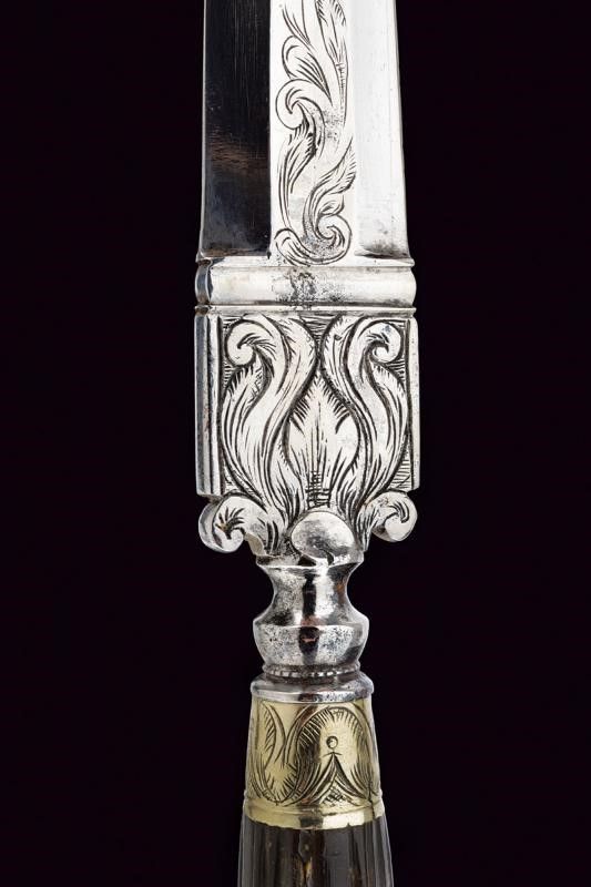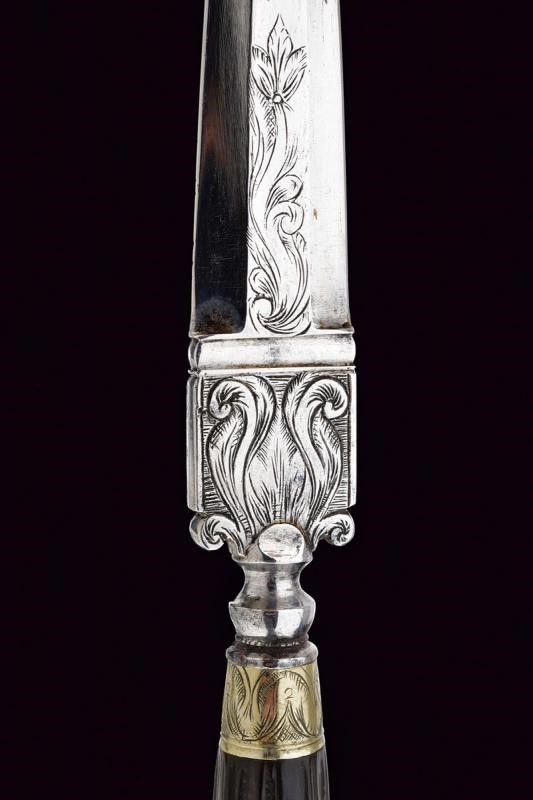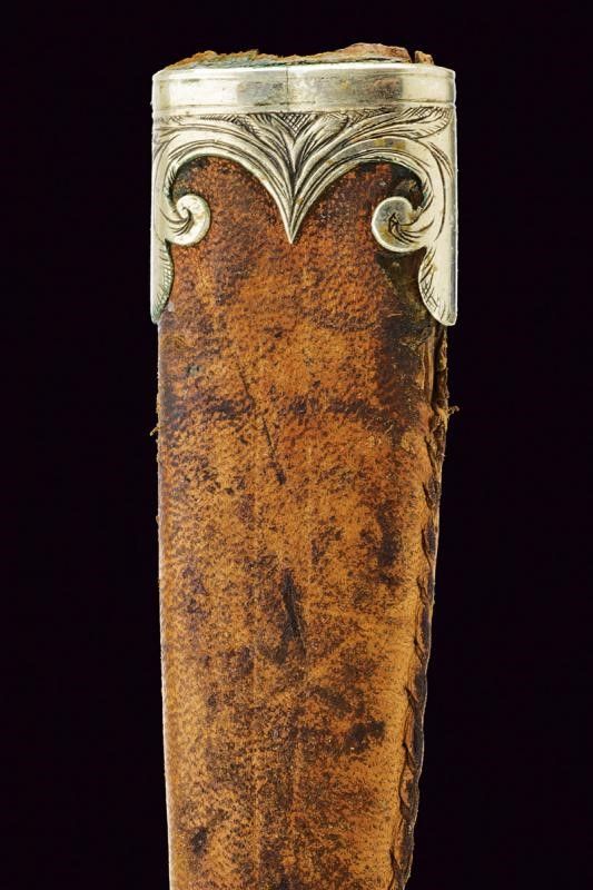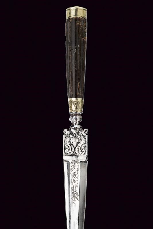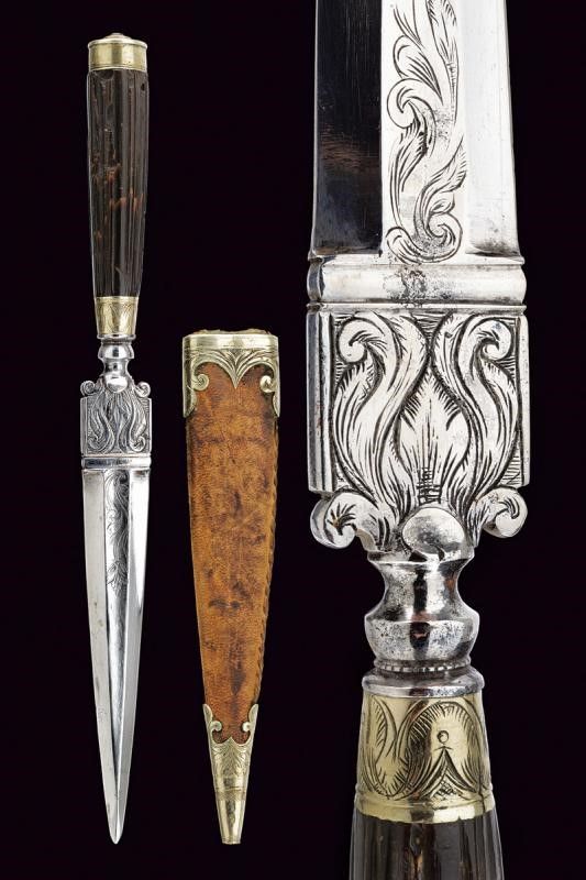 Italia meridionale, lunghezza 28 cm. Robusta lama in acciaio a due fili, sgusciata al centro ed incisa a motivi floreali; il tallone inciso e intagliato a riccioli. Impugnatura in corno (mancanze) con ghiera e cappa in metallo bianco inciso. Fodero in cuoio con fornimenti decorati en suite.