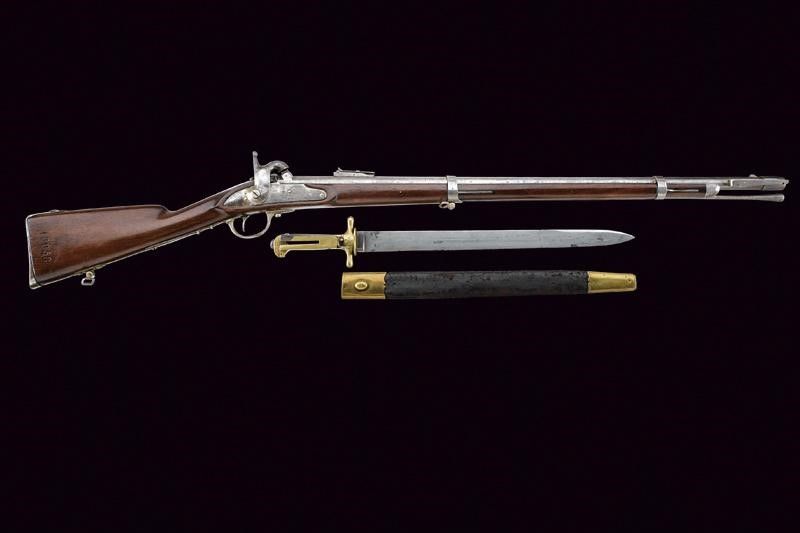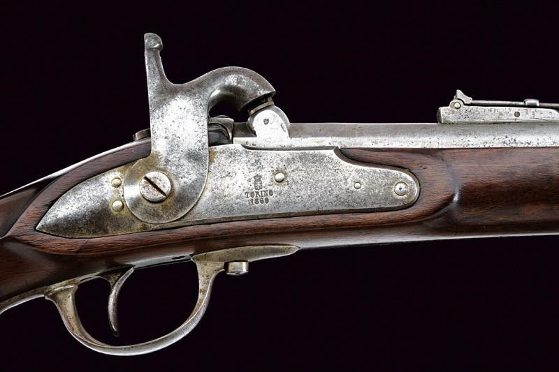 Torino, lunghezza 125.5 cm. Canna tonda rigata (anima con leggero pitting, rigatura ben visibile), con base ottagonale marcata con tre punzoni poco visibili, dotata di alzo abbattibile e regolabile, con mirino ed attacco per la baionetta, cal. 18 mm. in volata. Codetta munita di alzo. Batteria a molla in avanti marcata 'TORINO 1860' sotto scudo sabaudo. Meccanica funzionante a due scatti. Cassa intera in legno con pala marcata '13858'. Fornimenti e bacchetta in ferro. Insieme con la sua rara baionetta con punzone alla base, il fornimento con marcature '43..3 2345 M'. Altre marcature al pomo. Completa del suo fodero in cuoio con fornimenti in ottone.