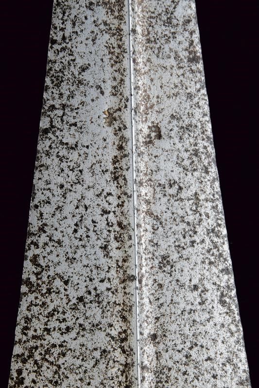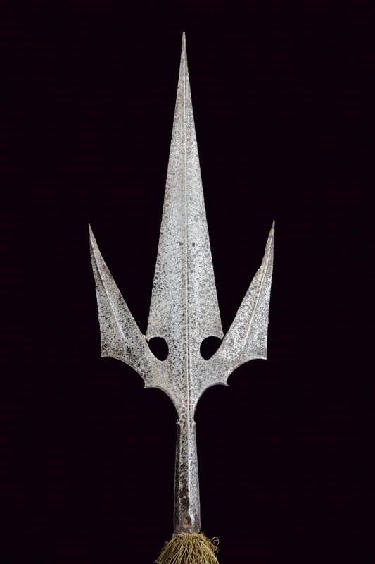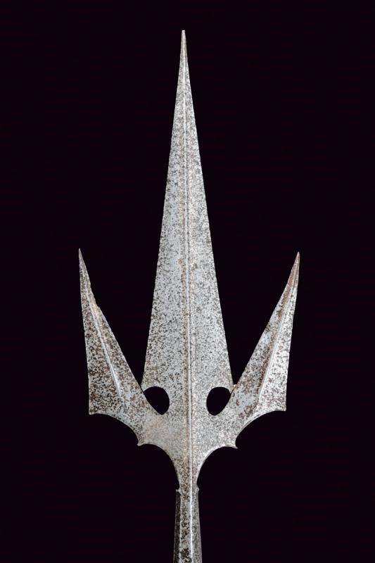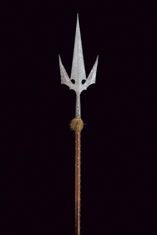 Veneto, lunghezza 220 cm. Prima metà del XVI Secolo Bel ferro con cuspide a lama dritta a due fili, nervata al centro; con breve collo; ali a due fili nervate fino alla punta e con piccole gobbe cuspidate verso l'esterno; gorbia faccettata, senza bandelle. Su fusto cilindrico, di epoca successiva, in legno decorato con rivetti in ottone e nappa in canutiglia dorata.