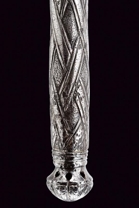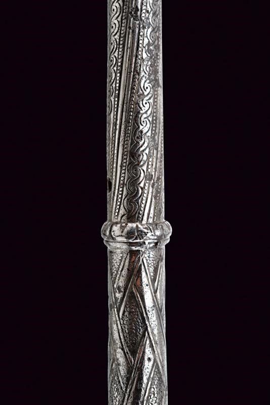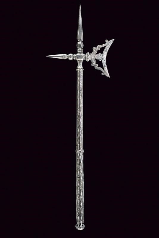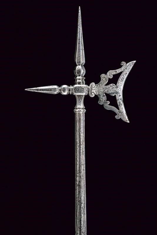 Europa orientale, lunghezza 75.7 cm. XVI Sec. Scure con taglio concavo, traforata, intagliata ed incisa. Penna dritta, appuntita, con base sferica ed incisa a motivi floreali. Cuspide sommitale lavorata en suite con la penna. Fusto cilindrico crescente verso la base, riccamente inciso a bande nella parte superiore e con intreccio sulla lunga impugnatura, che termina in un pomo intagliato e traforato. Foro per la cinghia.