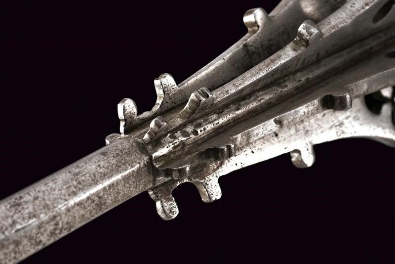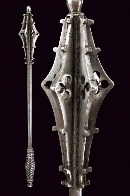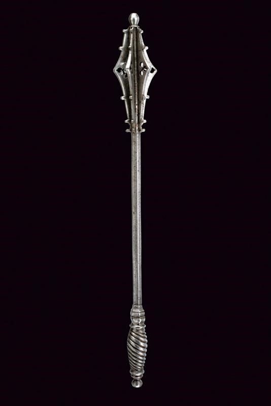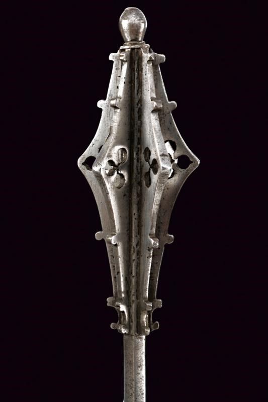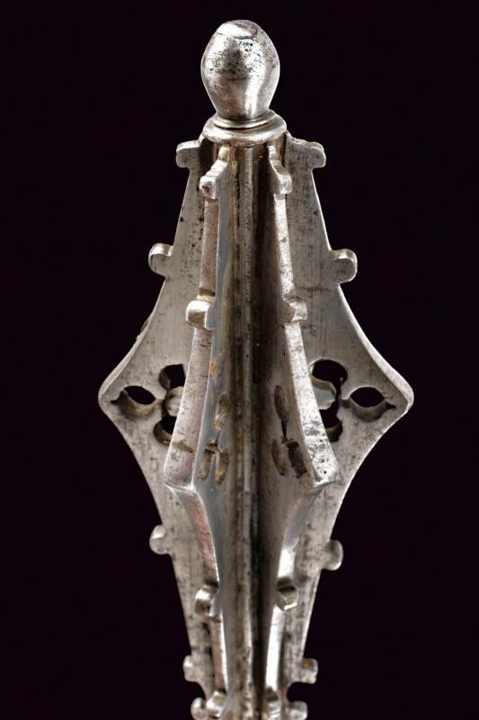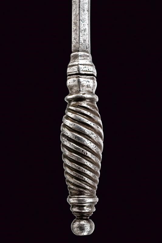 1500 circa In ferro, con lunga ed elegante testa formata da sei coste appuntite, traforate e munite di gobbe. Bottone sommitale a oliva. Fusto di sezione esagonale. Impugnatura ingrossata ed intagliata a spire.
