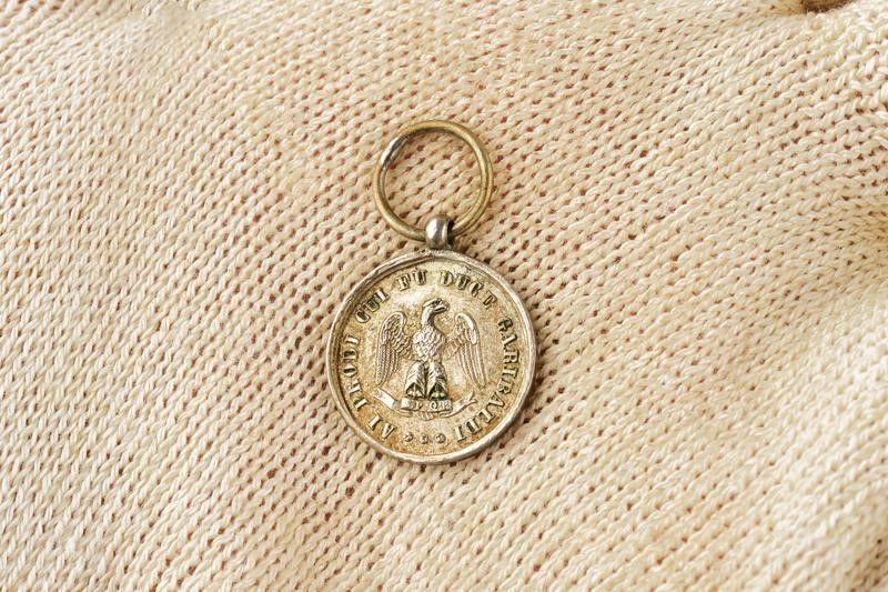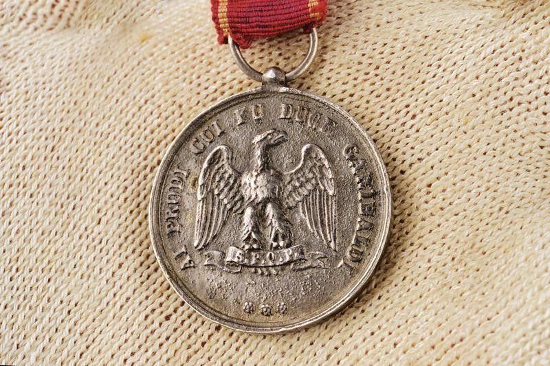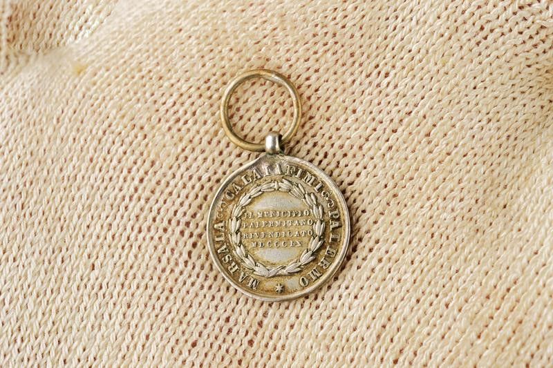 Palermo, diametro 30 mm. Seconda metà del XIX Secolo In argento. Al dritto l'aquila palermitana che regge il cartiglio 'S.P.Q.P.' e circondata dal motto 'AI PRODI CUI FU DUCE GARIBALDI' che termina in corrispondenza del cartiglio stesso. Al rovescio 'IL MUNICIPIO PALERMITANO RIVENDICATO' entro un serto e 'MARSALA CALATAFIMI PALERMO' accanto al bordo. Con un sottile nastrino giallorosso. Qualche segno d'uso e del tempo. Probabilmente una fusione antica fatta realizzare dal proprietario dell'originale.Tipologia del primo conio. Insieme con un mignon (coevo?).