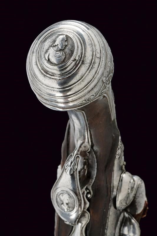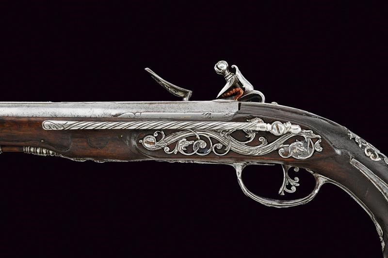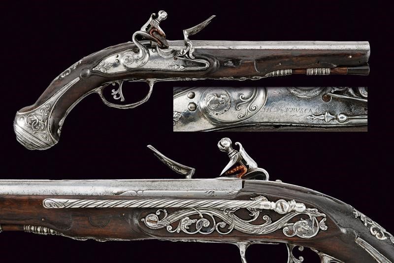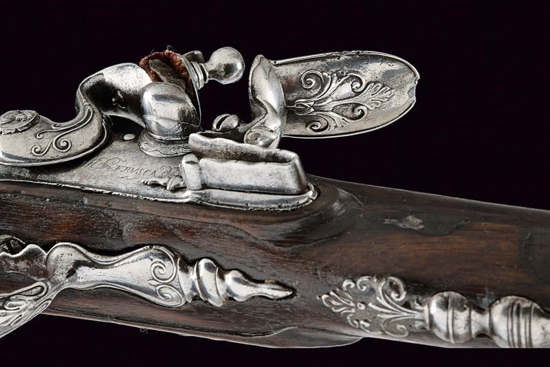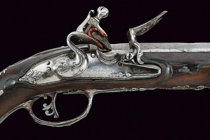 Canna liscia tonda, con base quadra, recante un punzone sul lato sinistro, con bindella sagomata e con medaglione recante un busto alla base, firmata 'LAZARO LAZARIN', cal. 13 mm. Batteria a pietra focaia firmata 'PICIN FRUSCA', la codetta intagliata con fiorame, la vite del cane con un busto. Cassa intera in legno con bellissimi fornimenti in acciaio intagliati a busti, serpenti e a motivi floreali. Gancio da cintura lavorato a spire, piccoli difetti e mancanze. Bacchetta in legno con battipalla in corno. In patina. I fornimenti di buona qualità .