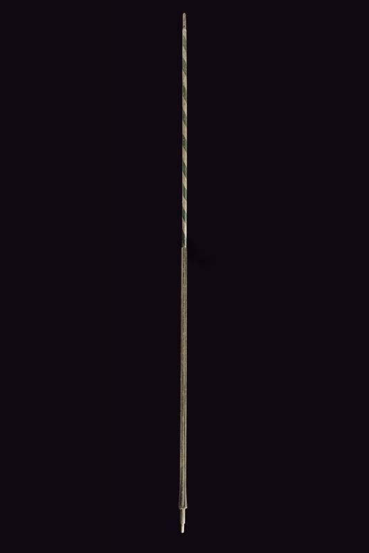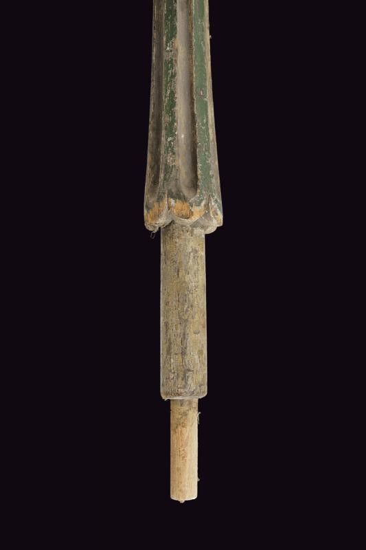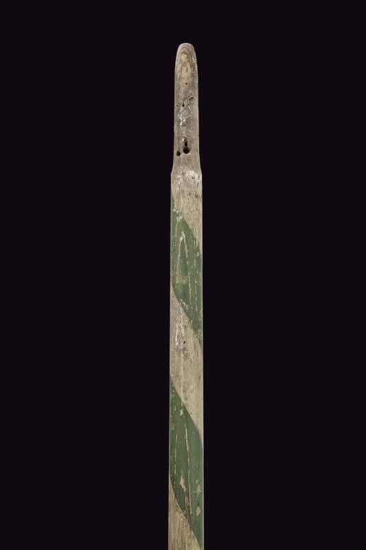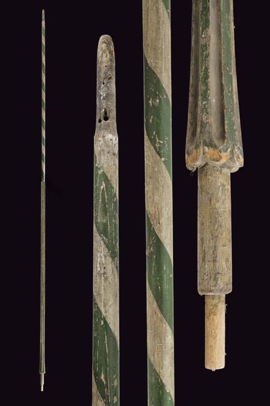 Germania, lunghezza 364 cm. XVIII Secolo In legno, a due ordini, mancante del rocchio. Il segmento verso la punta di sezione circolare, quello verso l'impugnatura allargato e munito di profondi sgusci longitudinali. L'impugnatura sempre in legno priva del segmento posteriore. Tutta la superficie reca resti di antica colorazione, in verde e bianco a spirale nel tratto cilindrico, con tracce di doratura all'interno degli sgusci. Seppur probabilmente un esemplare di tarda produzione comunque un oggetto di grande fascino e rarità .