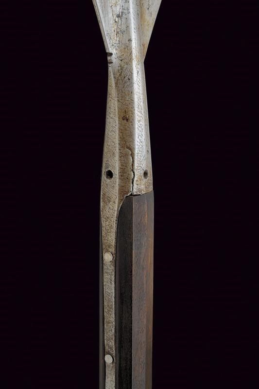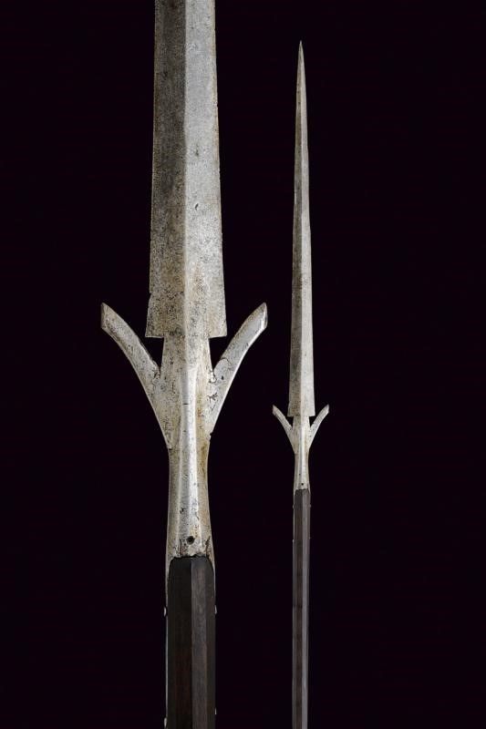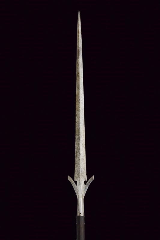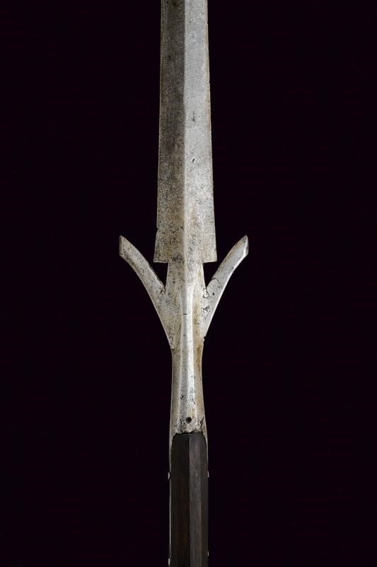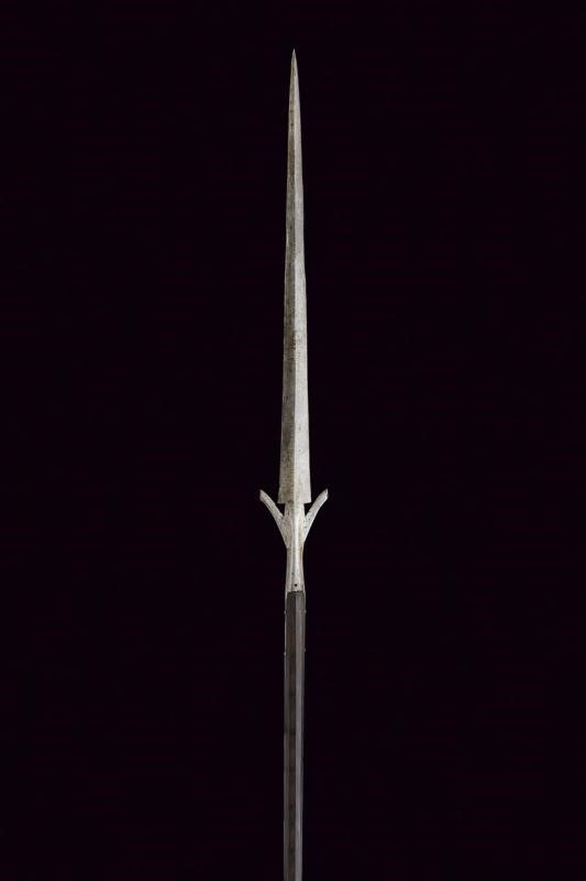 Italia settentrionale, lunghezza 250.5 cm. fine del XV Sec. Lunghissima cuspide di forma triangolare a due fili costolata in mezzeria, con base rastremata e munita di due corte alette. Gorbia troncoconica e faccettata (alcuni danni e sfogliature). Con bandelle originali accorciate, su asta lignea moderna.
