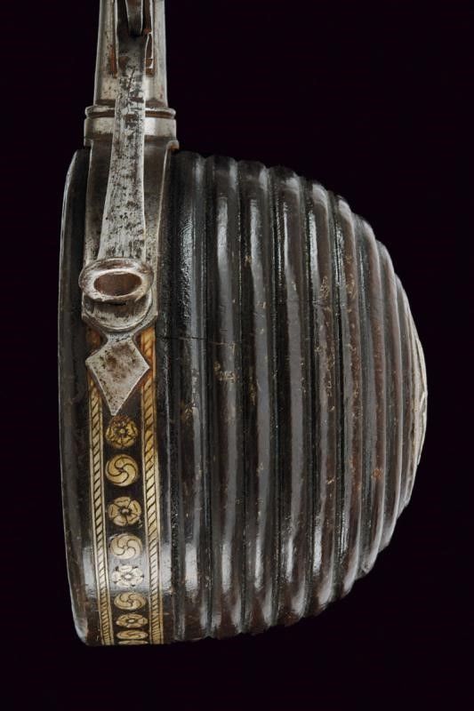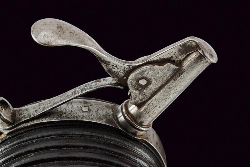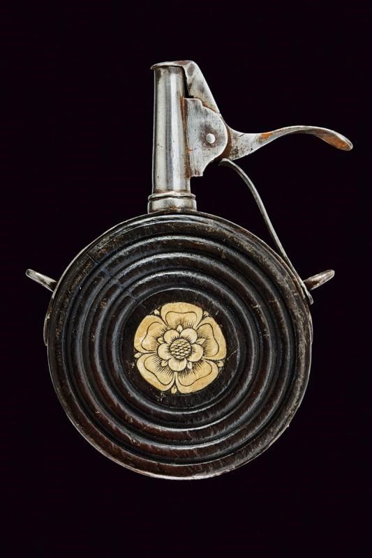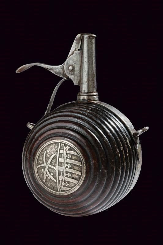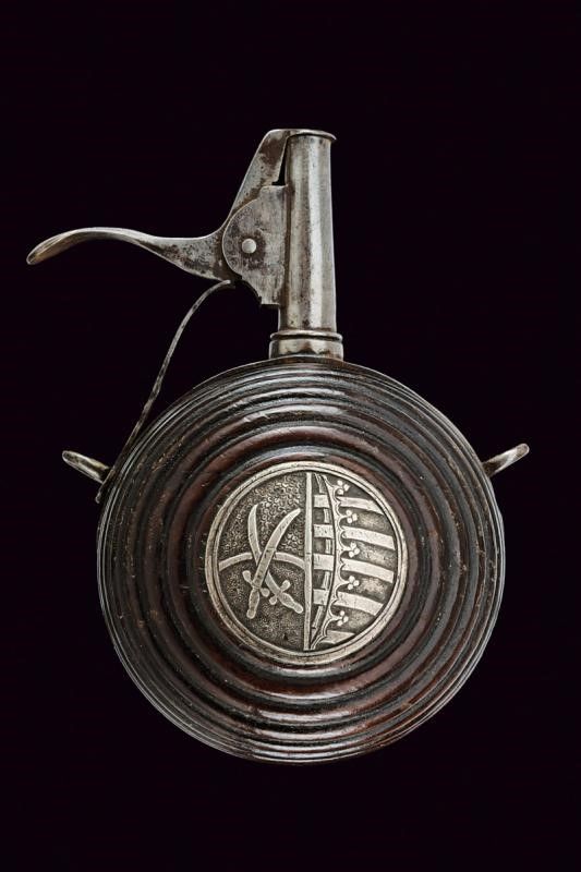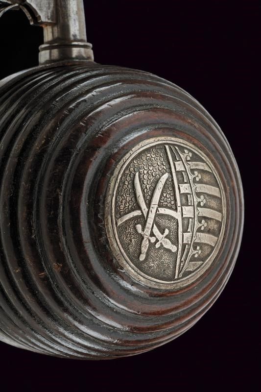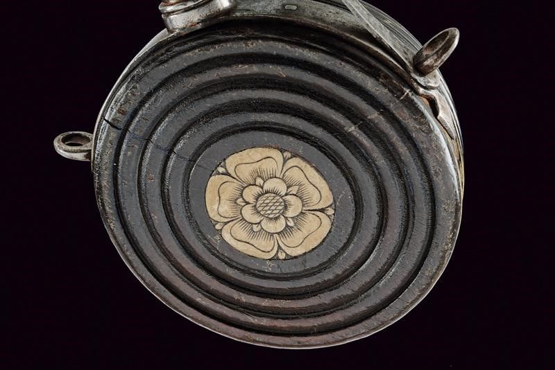 Sassonia, dimensioni 7.9 x 12.8 cm. Corpo circolare convesso, in legno, piatto sul retro, lavorato ad anellature concentriche. Il lato posteriore recante al centro una rosetta in osso intagliata a fiore. La parte frontale con medaglione convesso, in argento, recante lo stemma dei reali di Sassonia. Cannello con chiusura a molla in ferro, come anche i due anelli di sospensione.