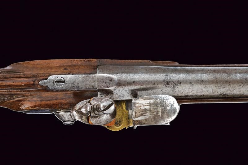 Stato Pontificio, lunghezza 34.5 cm. Canna liscia tonda, culatta ottagonale con brevissima bindella, cal. 16 mm. Batteria a pietra focaia con cartella firmata 'Fll. Mazzocchi', scodellino in ottone. Cassa intera in legno (venature e restauro al muso) con calcio finemente zigrinato e con base scolpita a ragnatela. Fornimenti in ottone, la coccia con iniziali dell'ufficiale e bordo inciso a motivi floreali. Bacchetta in legno con battipalla in ottone.