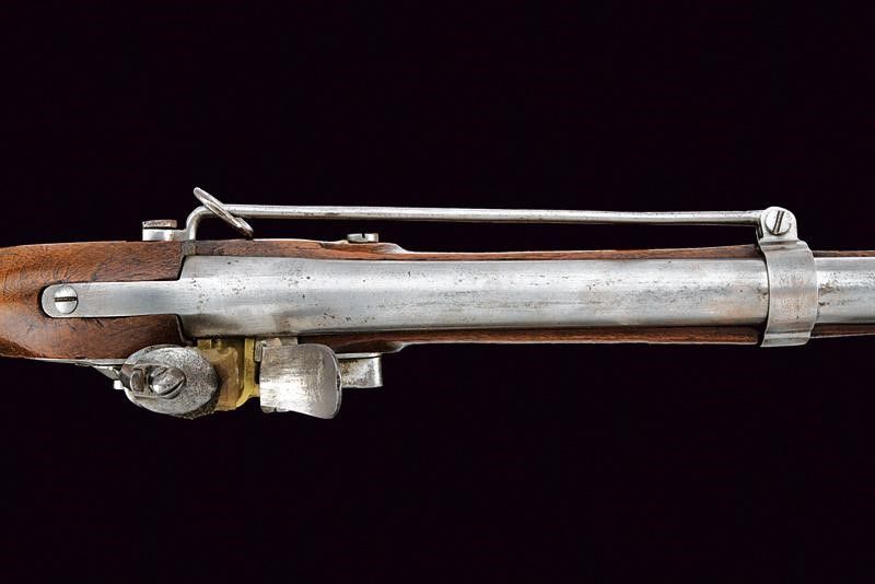 Stato Pontificio, lunghezza 99.5 cm. Canna liscia, tonda, con base ottagonale, cal. 18 mm. Batteria a pietra focaia marcata 'GM' con scodellino in ottone. Cassa intera in legno (piccolo difetto al codolo del calciolo) con fornimenti in ottone. Fascetta con mirino. Completo della rara barra con anello da sella. Bacchetta in ferro.