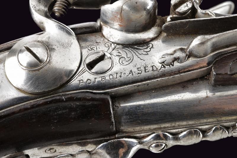 Francia, lunghezza 50 cm. Canne tonde, lisce con culatta quadra e base decorata ad anellature, cal. 13 mm; codette incise a fiorame; lunghe batterie a pietra focaia firmate 'BOIRON A SEDAN' ed incise en suite; casse intere in radica con fornimenti in ferro, ponticelli scanalati, cocce decorate a mascheroni. Bacchette in legno con battipalla in corno chiaro.