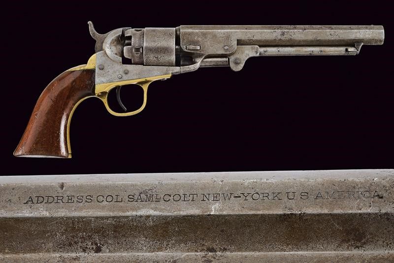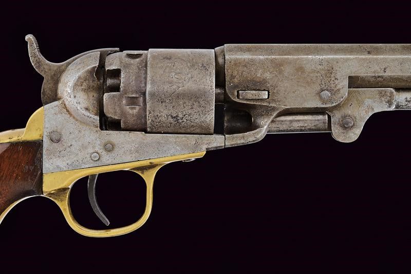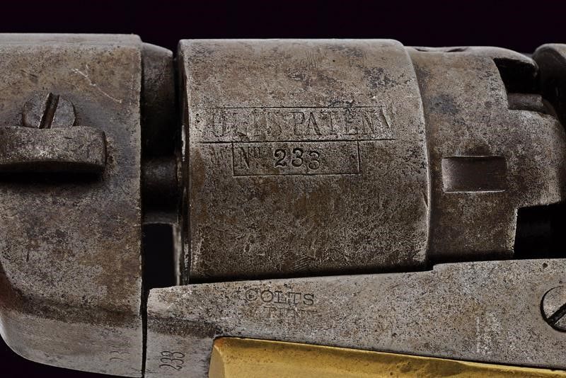 1861 Canna tonda da 6-1/2' (un po' di pitting all'interno, rigatura visibile), recante al dorso marcatura 'ADDRESS COL SAM.L COLT NEW-YORK US AMERICA', cal. 36. Fermo della canna con numerazione coeva alle altre parti. Tamburo ribassato recante resti di scena della diligenza, cinque colpi; brevetto leggibile e matricola coeva al castello. Meccanica funzionante. Il castello con matr. '2xx', tracce della medesima matricola alla base della canna e numerazione ben visibile e coeva sulle bande dell'impugnatura. Queste entrambe in ottone. Perno del tamburo senza numeri, all'interno punzone 'B'. Superfici in ferro con segni d'uso, del tempo e intaccature. Ponticello marcato '36 CAL'. Impugnatura in noce.